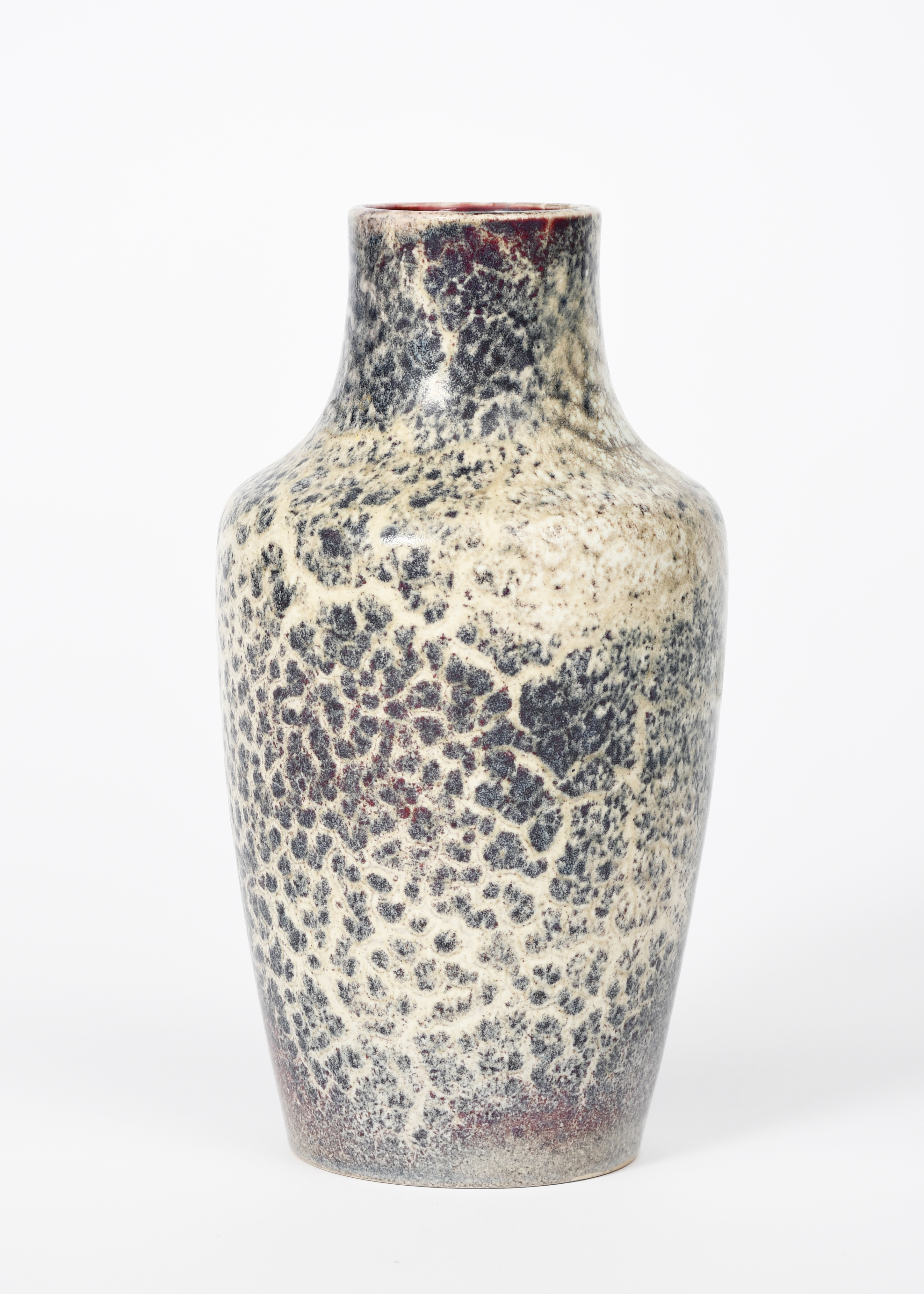 A Ruskin Pottery high-fired stoneware vase by William Howson Taylor, dated 1920, shouldered form, covered in a fissured purple and blue glaze over white, with flambe patches, impressed marks, professional restoration to neck, 20.5cm. high