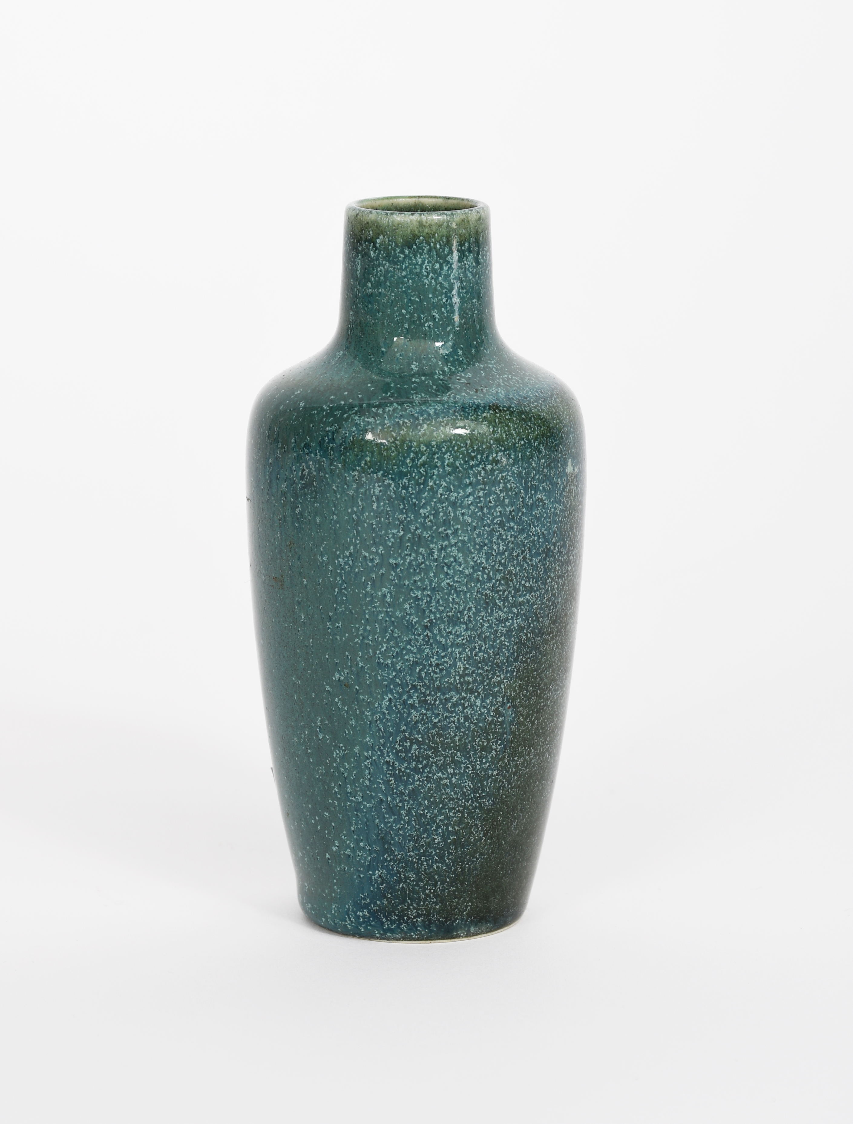 A Ruskin Pottery high-fired stoneware vase by William Howson Taylor, slender, shouldered form with cylindrical neck, covered in a mottled moss green souffle glaze, impressed WHT monogram, 231 shape no and remains of Ruskin Pottery paper label, 11cm. high