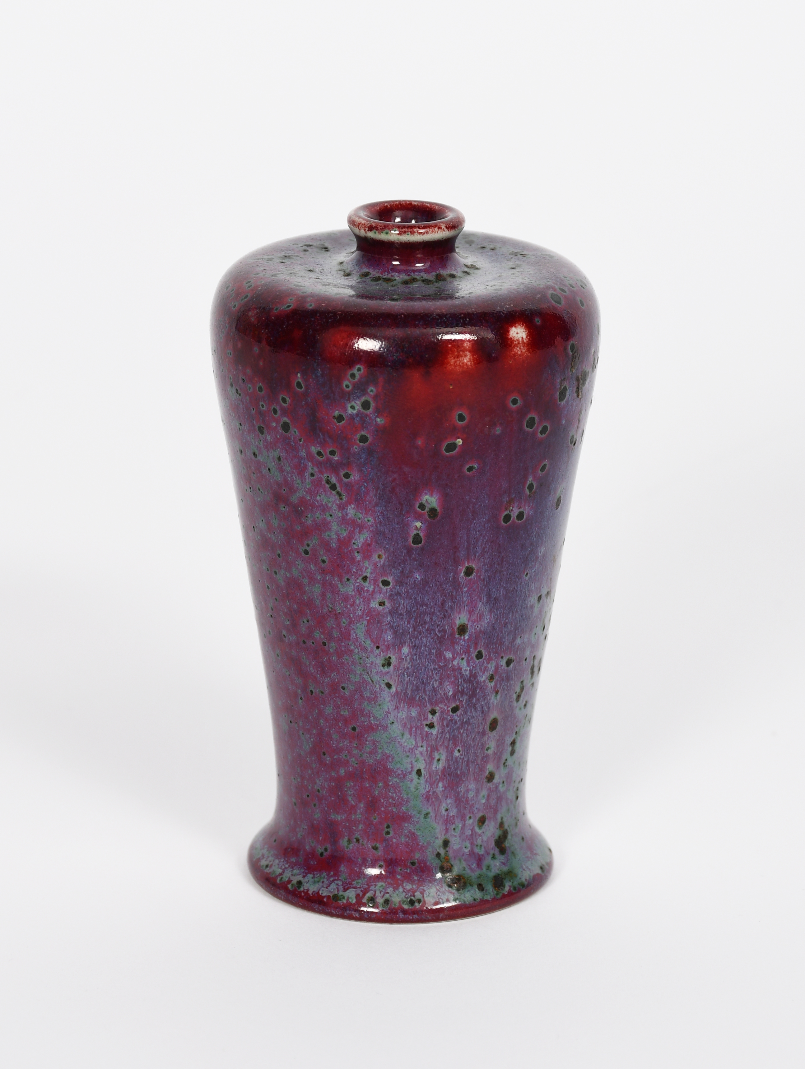A Ruskin Pottery high-fired stoneware vase by William Howson Taylor, dated 1905, shouldered, cylindrical form, covered in a mottled sang de beouf and purple glaze speckled with turquoise, impressed WHT mark, shape no.100, 10.5cm. high