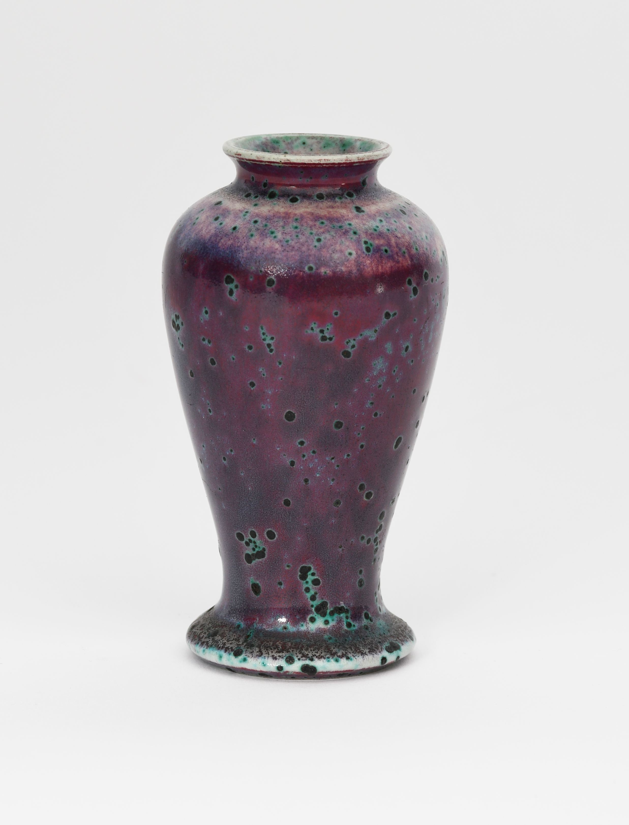 A Ruskin Pottery high-fired stoneware vase by William Howson Taylor, dated 1905, slender baluster form, covered in a purple glaze streaked with lavender, turquoise speckles, impressed factory mark and date and shape no.96, 10cm. high