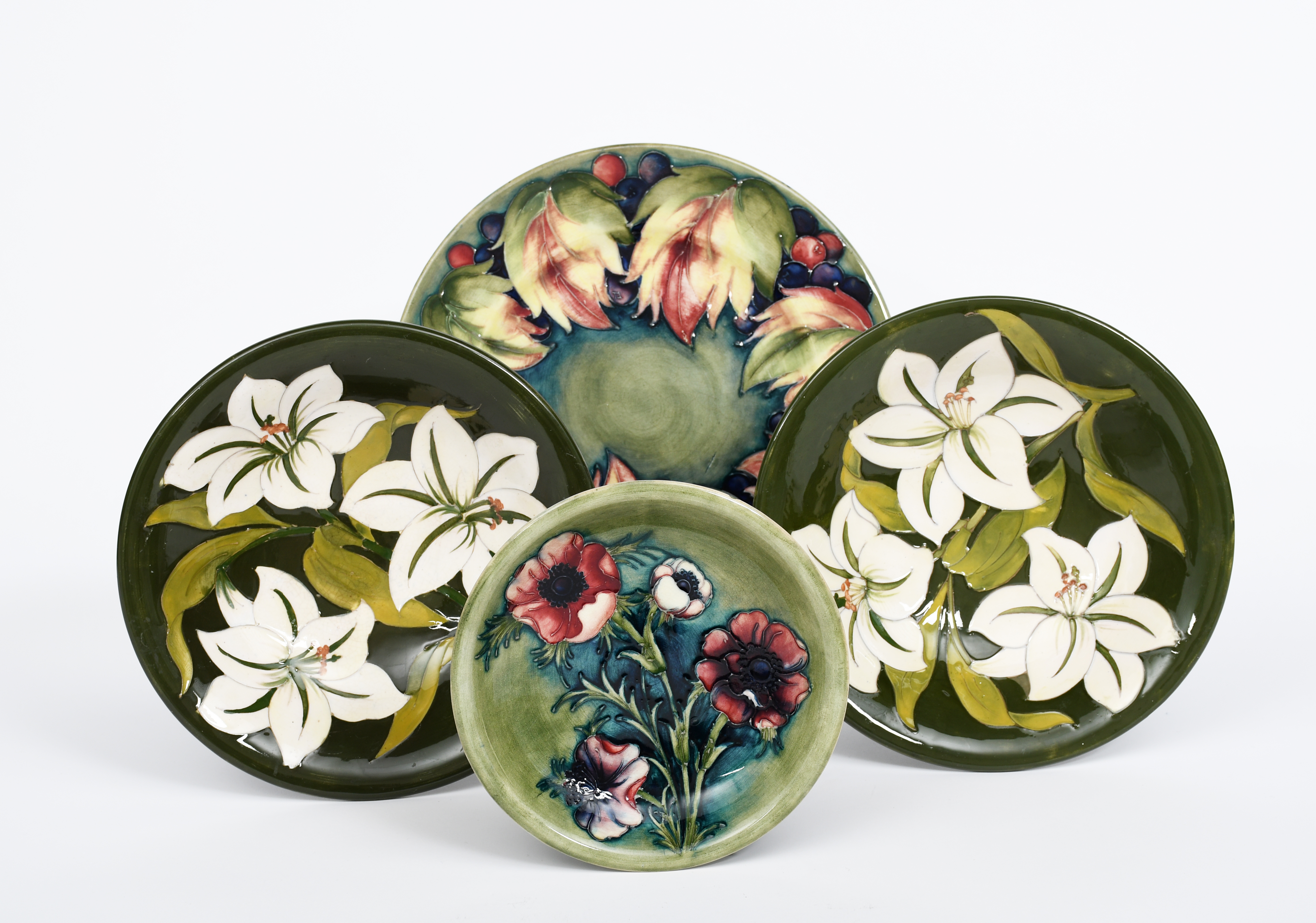 Leaf and Berry a Moorcroft Pottery plate, tubeline decorated to the rim with a band of leaf and berry in shades of pink, purple, yellow and green on a green ground, two Moorcroft Bermuda Lily bowls designed by Walter Moorcroft and a Moorcroft Pottery Anemone plate impressed marks, painted signature, 29cm. diam. (4)