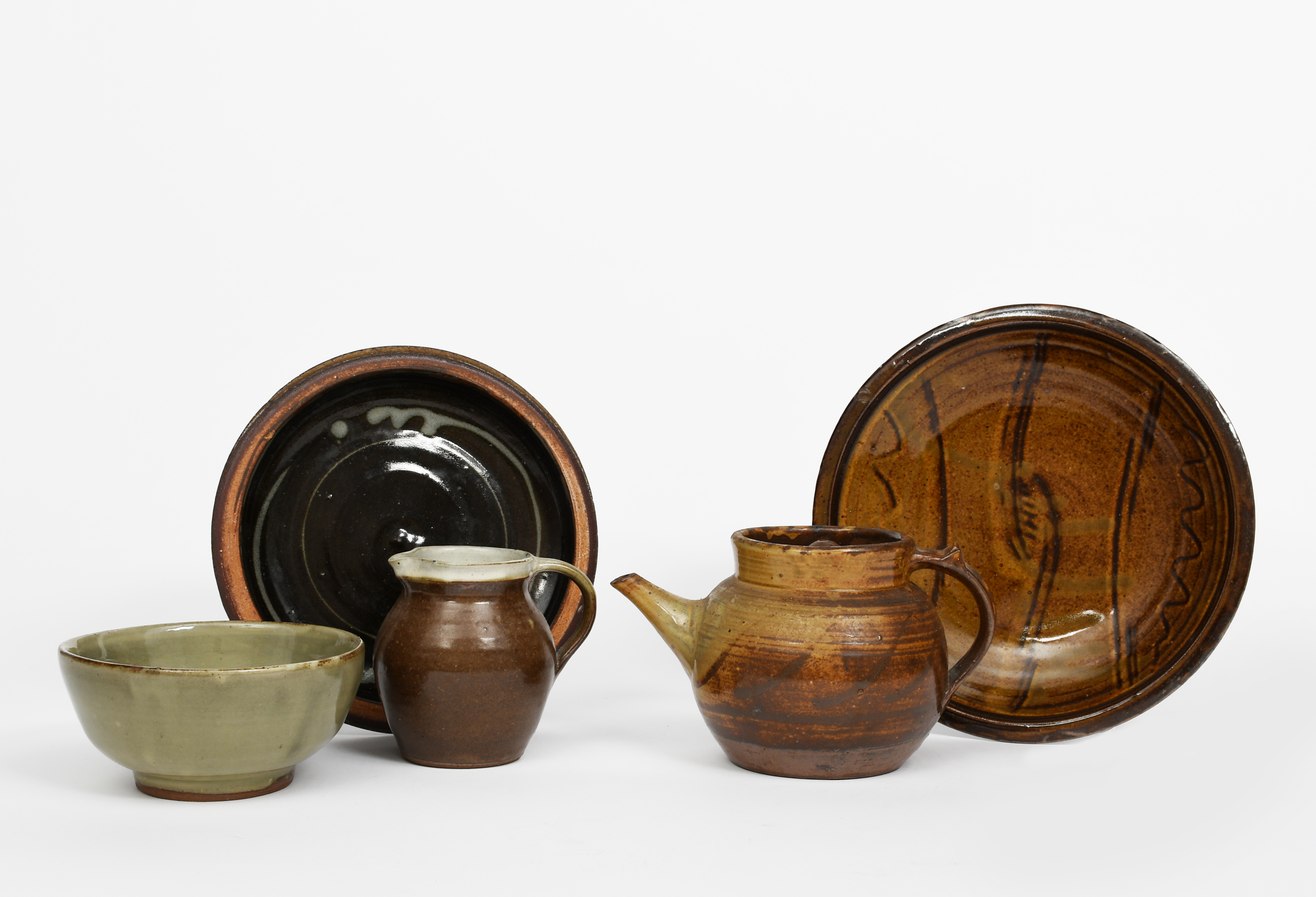 a stoneware plate decorated with simple river motif in yellow and ochre glaze, a Wenford Bridge teapot and cover by TE with simple brush design, and three other pieces, impressed seal marks, (6)