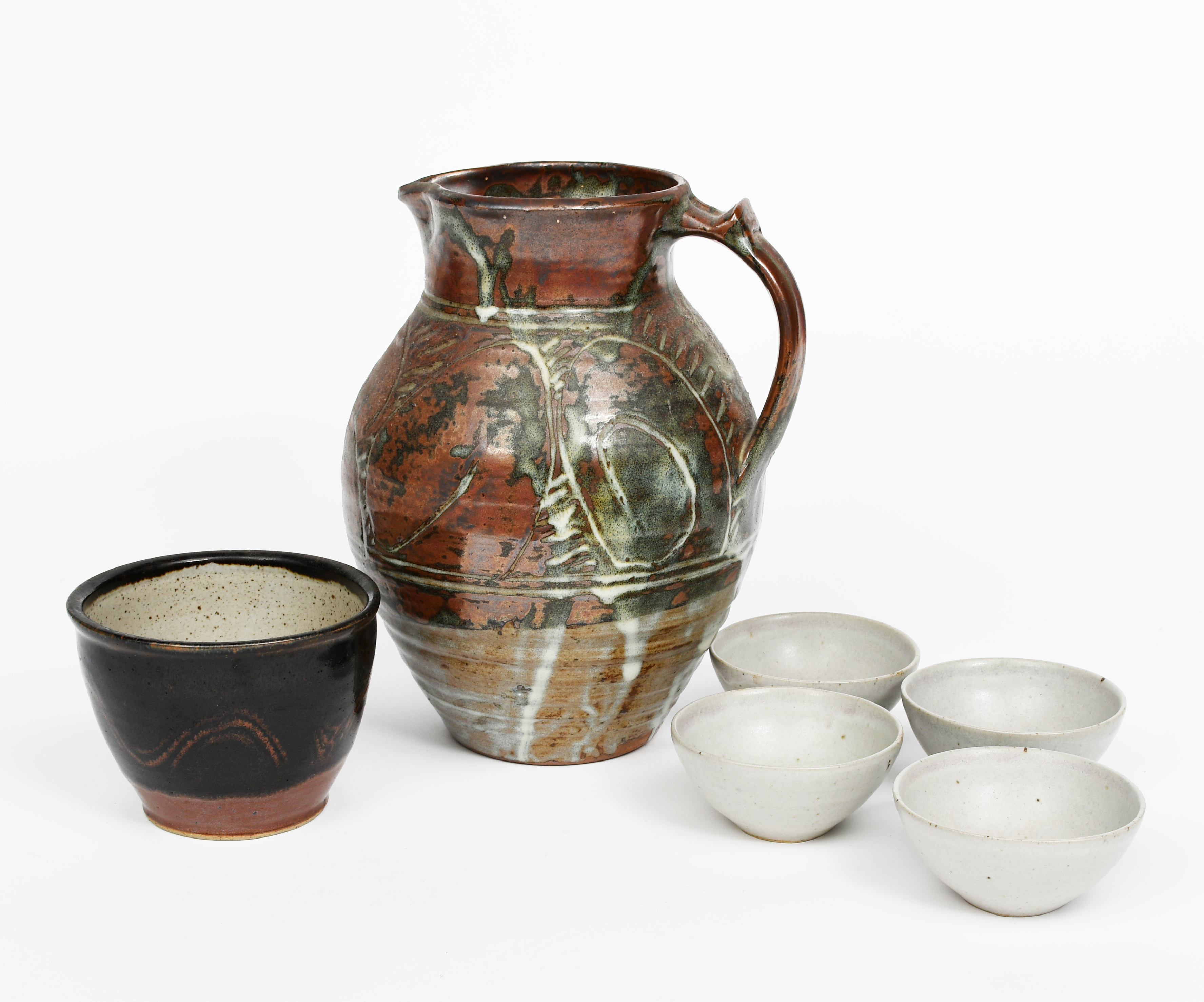 a large Yelland Pottery stoneware jug, incised with a band of scroll decoration glazed in tenmoku and ash, four Yelland Pottery bowls covered in a silver-grey glaze and another Yelland Pottery bowl impressed marks, 28.5cm. high (6)