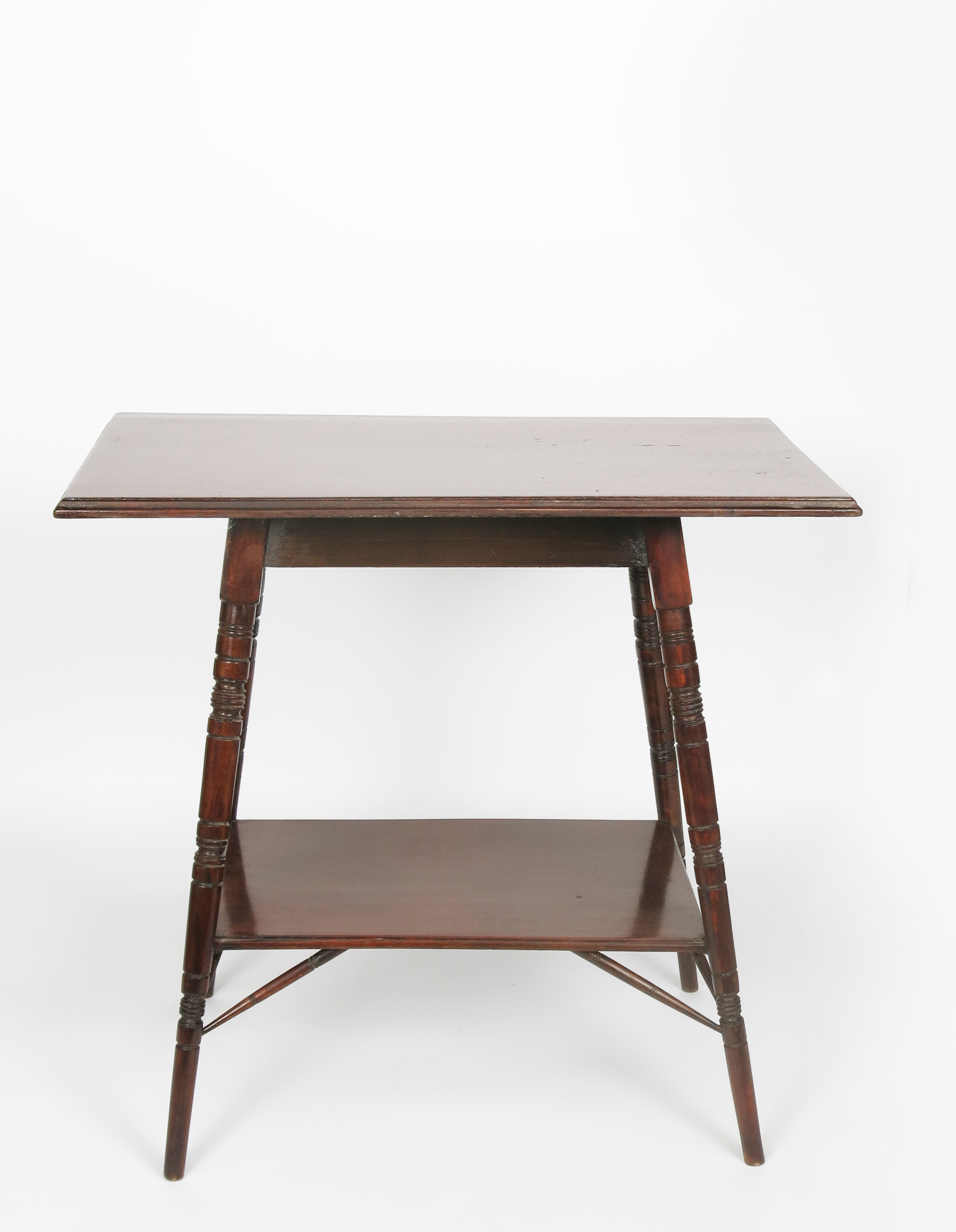 A mahogany occasional table probably retailed by Liberty & Co. Rectangular top on flaring, turned legs, with low shelf, unsigned, 68 x 40.5cm, 64cm. high