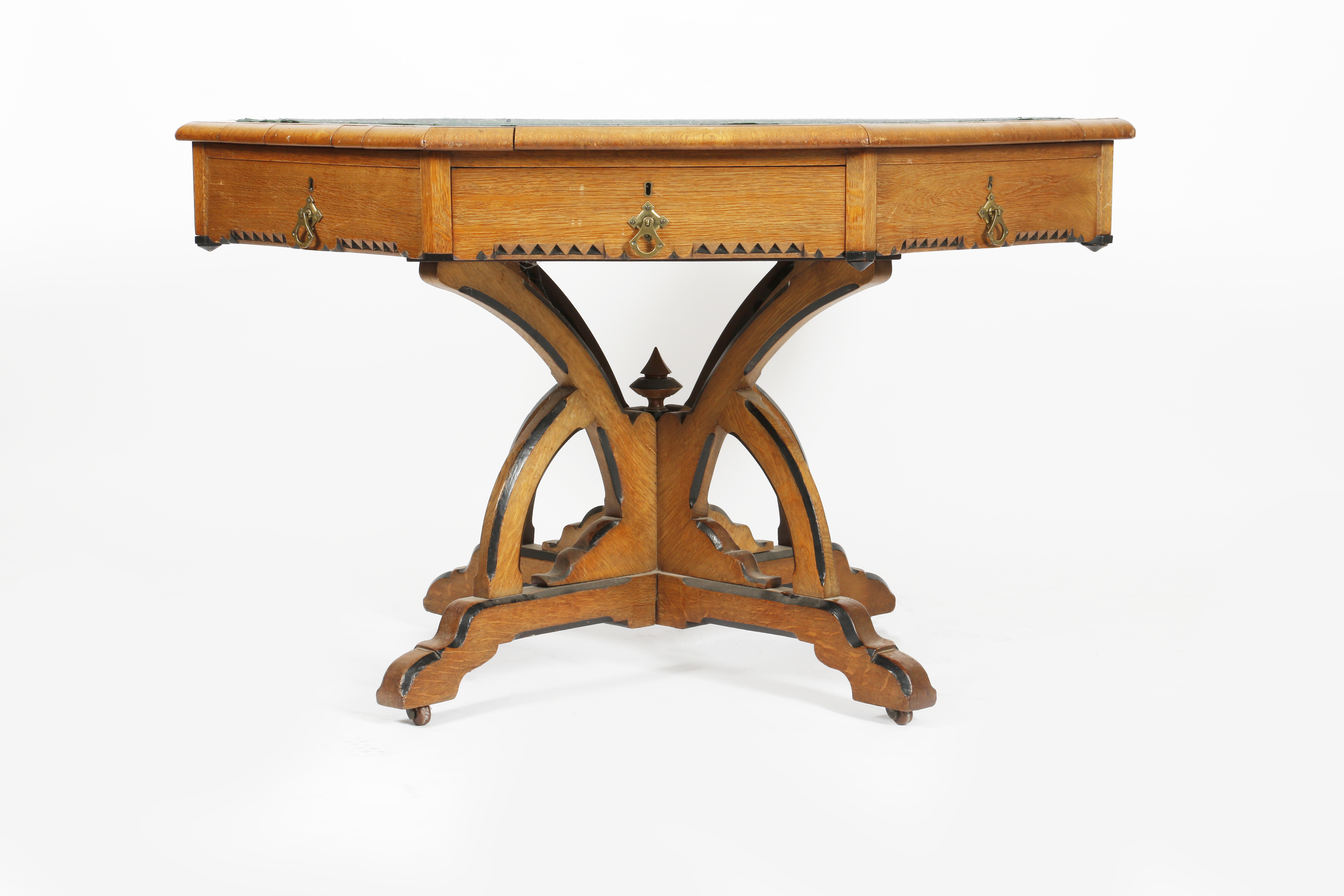 A Gothic Revival oak library table the design attributed to E.W. Pugin, octagonal with inset baize top, with four drawers and four blind drawers, one drawer with writing slope, each with Webb & Grew Birmingham locks and brass furniture, the four cruciform arched legs on cross base and inset castors, with carved geometric bands ebonised black, 120cm wide, 77cm high.