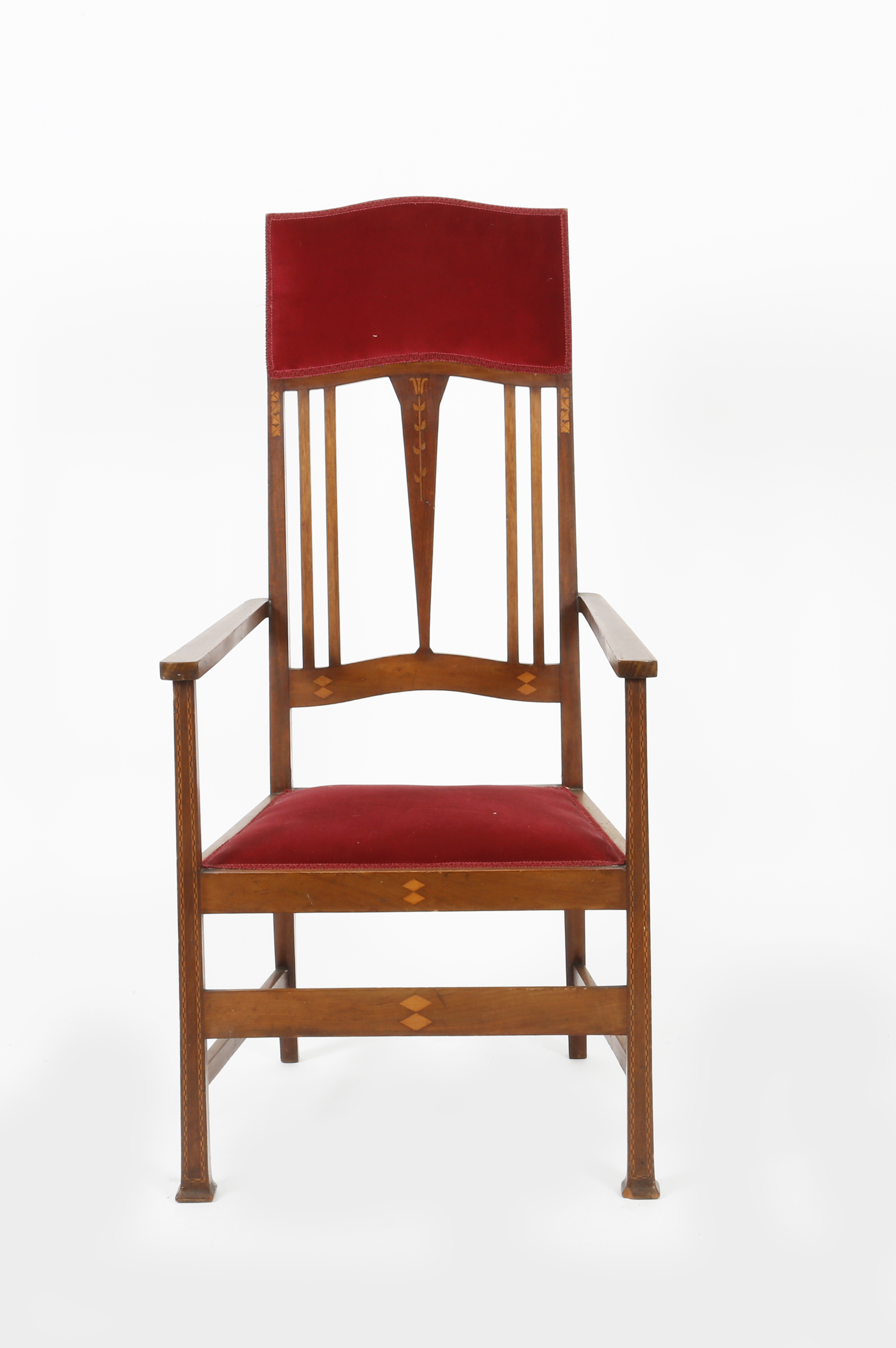 An Art Nouveau mahogany armchair, marquetry banded, the pierced tapering back with marquetry flower stem, red velvet padded seat and back pad, 119cm. high, 59cm wide