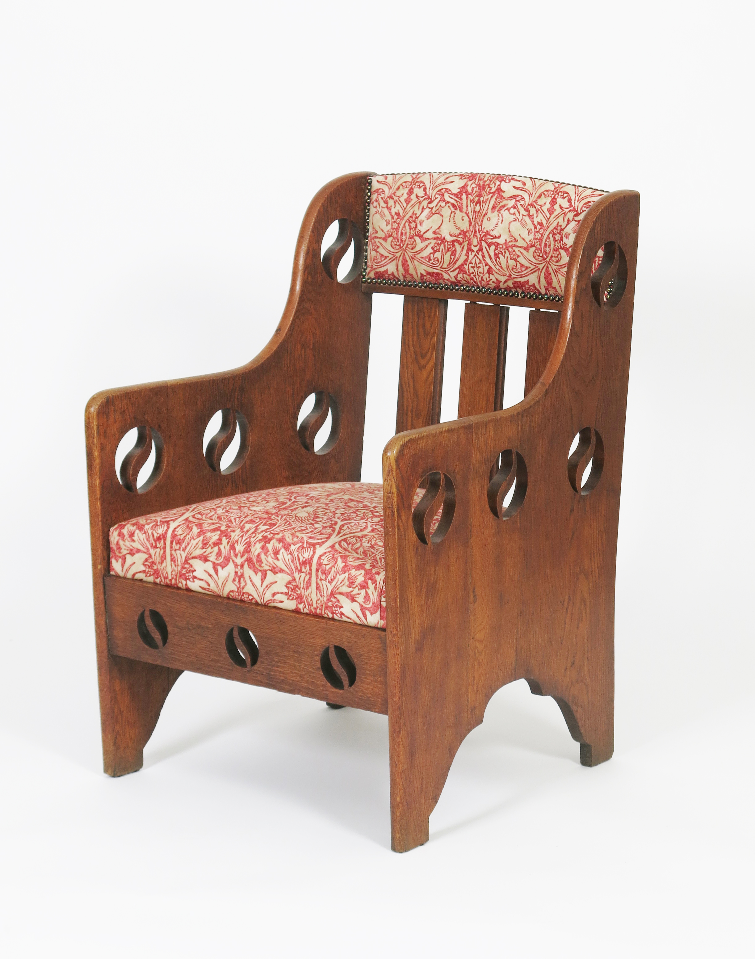 An oak armchair probably retailed by Goodyers, slat back, the solid plank arms with cut-out circle motif, the padded seat and back covered with Brer Rabbit material designed by William Morris, unsigned, 85cm. high
