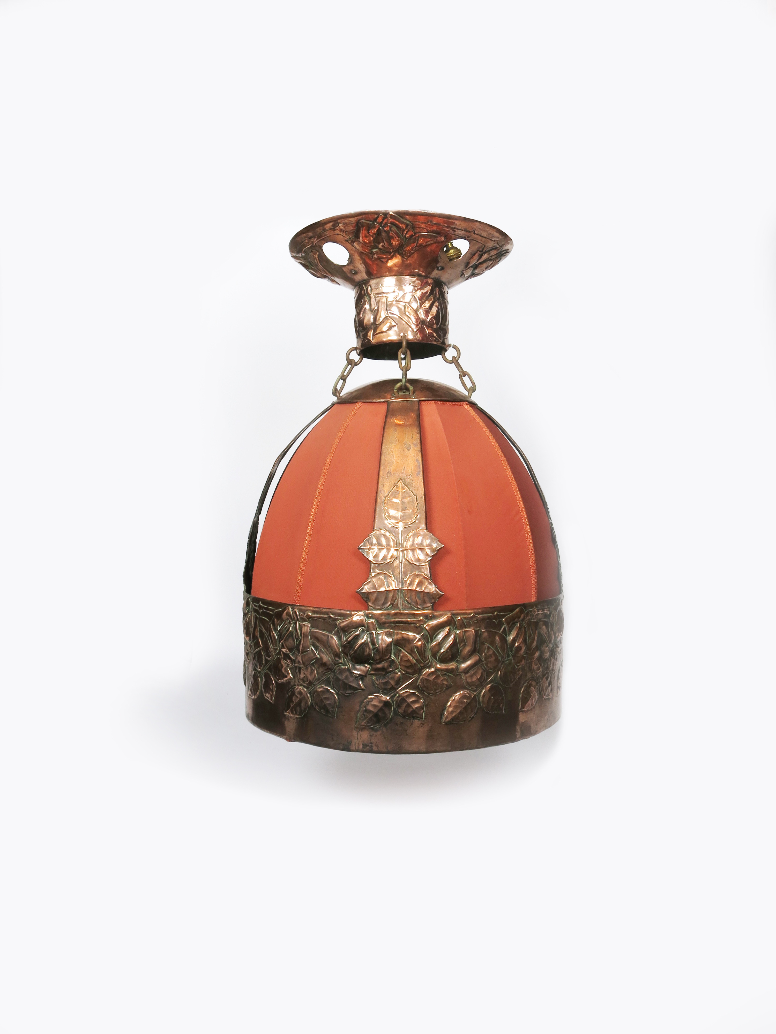 A large copper ceiling light, circular section stamped in low relief with rose flowers and foliage to the rim and column supports, hanging from a cylindrical support decorated with similar roses and three pierced light apertures, the light with red silk shade, unsigned, 52cm. diam, 77cm. drop.