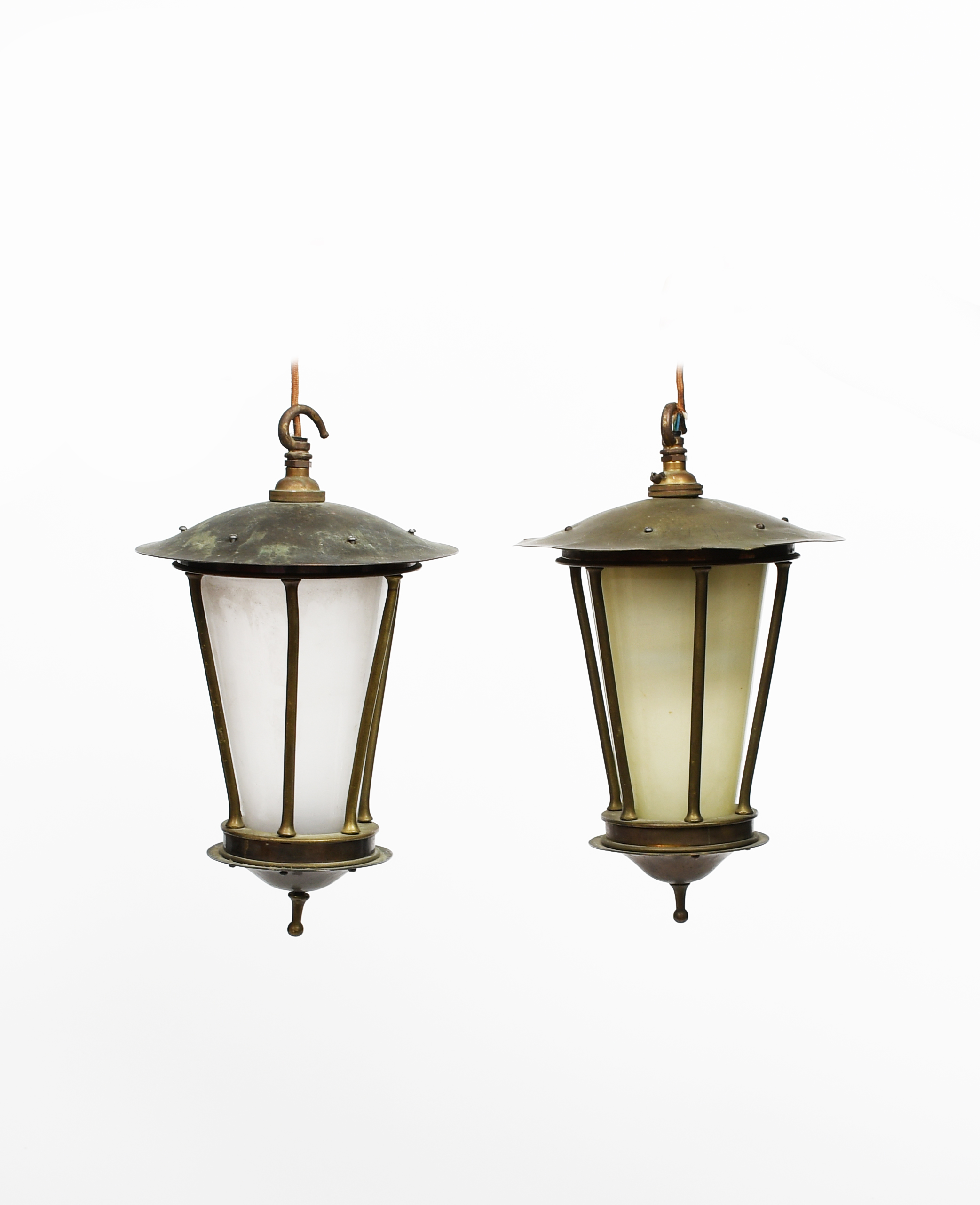 A pair of Birmingham Guild of Handicraft patinated copper and brass hall lanterns designed by...