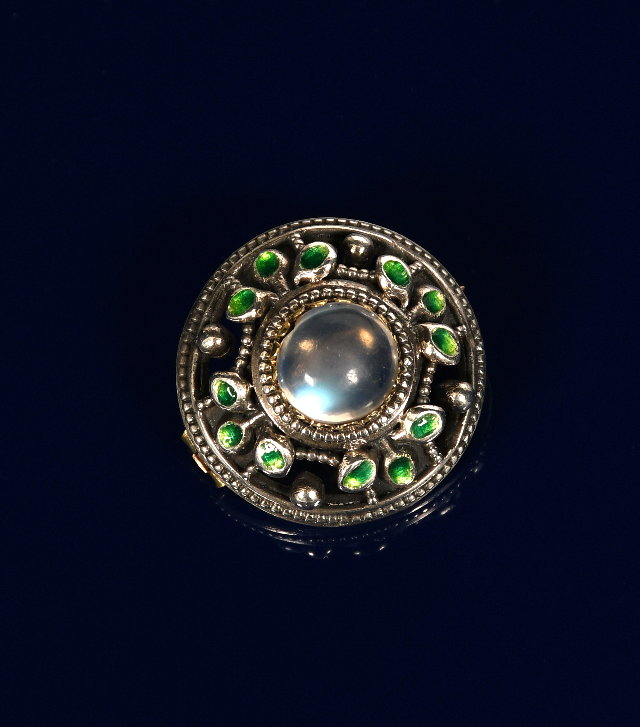 A Liberty & Co silver and enamel brooch the design attributed to Jessie M King, circular, domed wirework body with gold collet set with moonstone cabochon, simple leaf border enamelled green, inside beadwork border, unsigned, 2cm. diam,