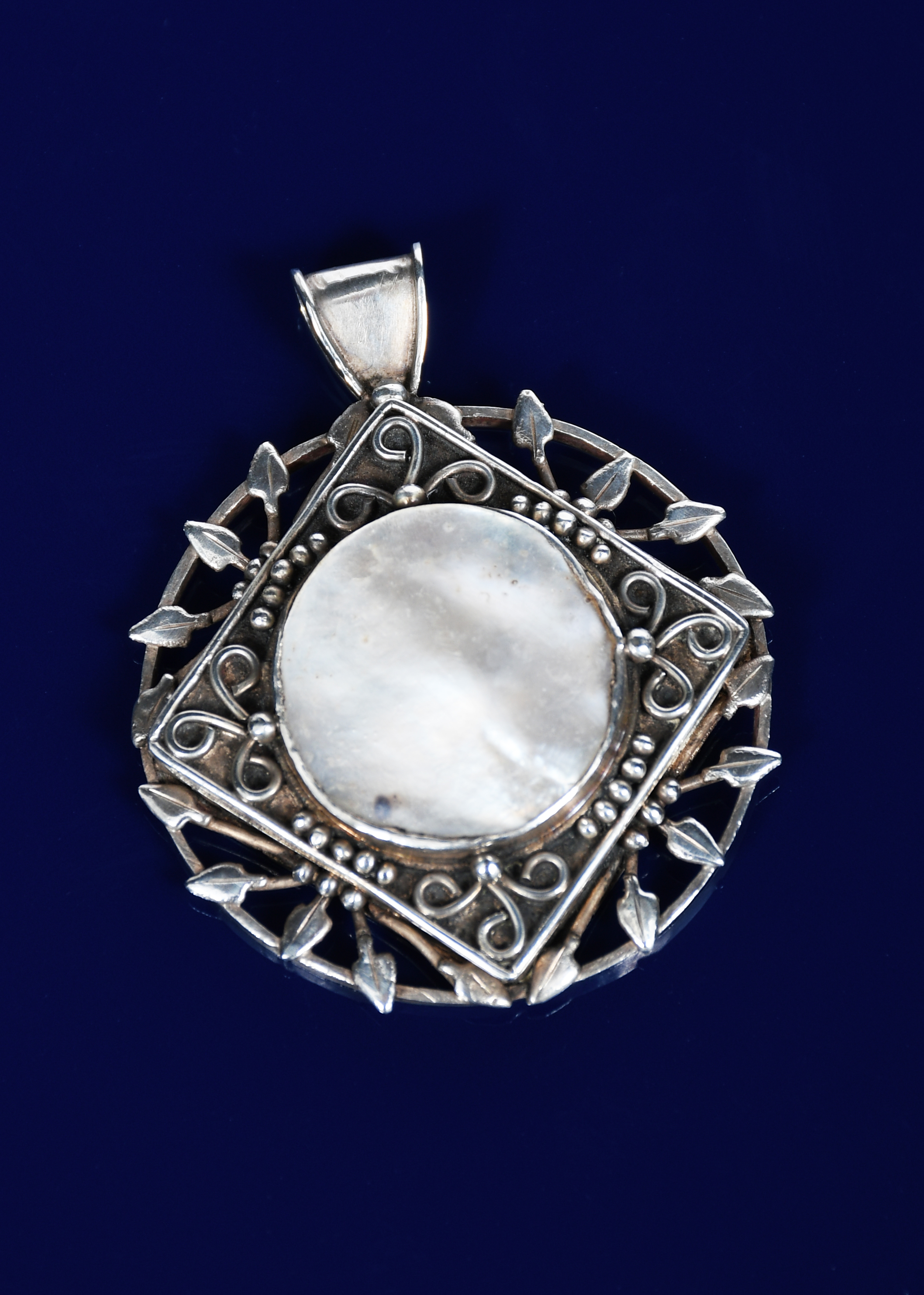 A silver pendant necklace, circular wirework frame with small leaf motif set in diamond shaped panel with wire scroll and central mother of pearl shell, 4.5cm. drop.