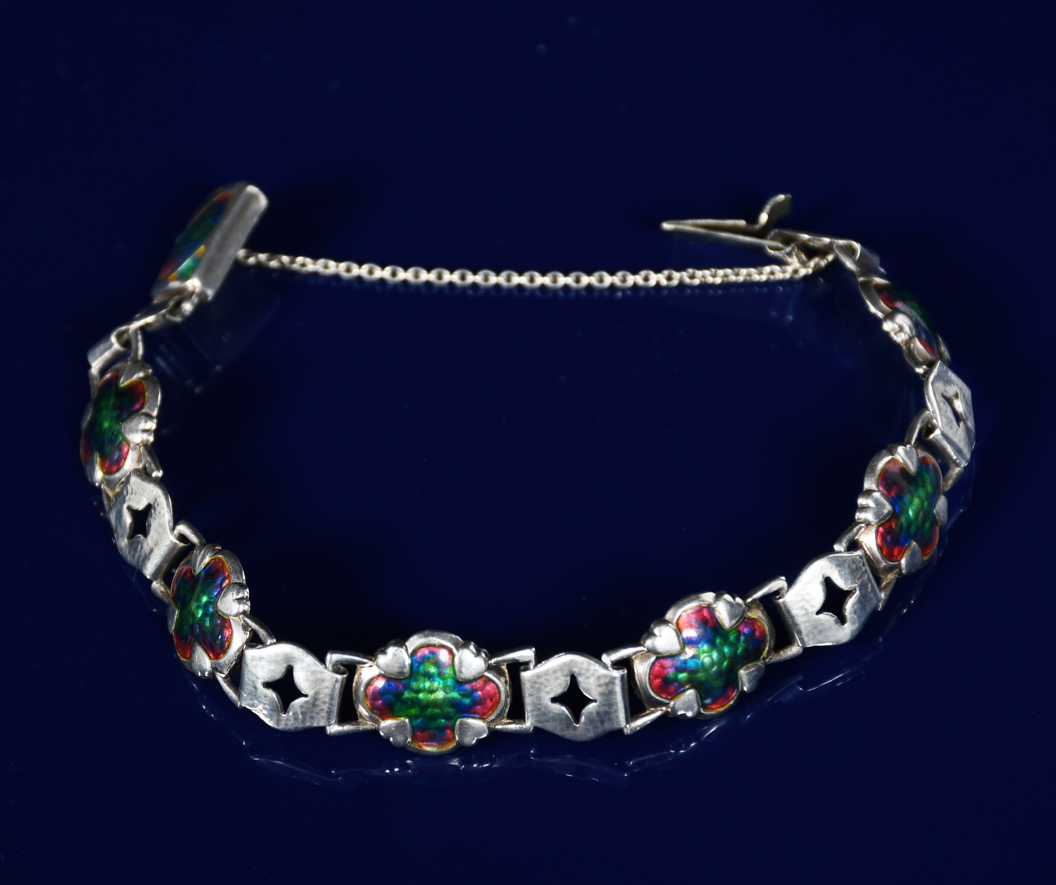 A silver and enamel bracelet, alternate silver panels one cast with flower-head motif enamelled in green, blue and red, the other a pierced aperture, rectangular clasp, with safety chain, unsigned, 19cm. long.