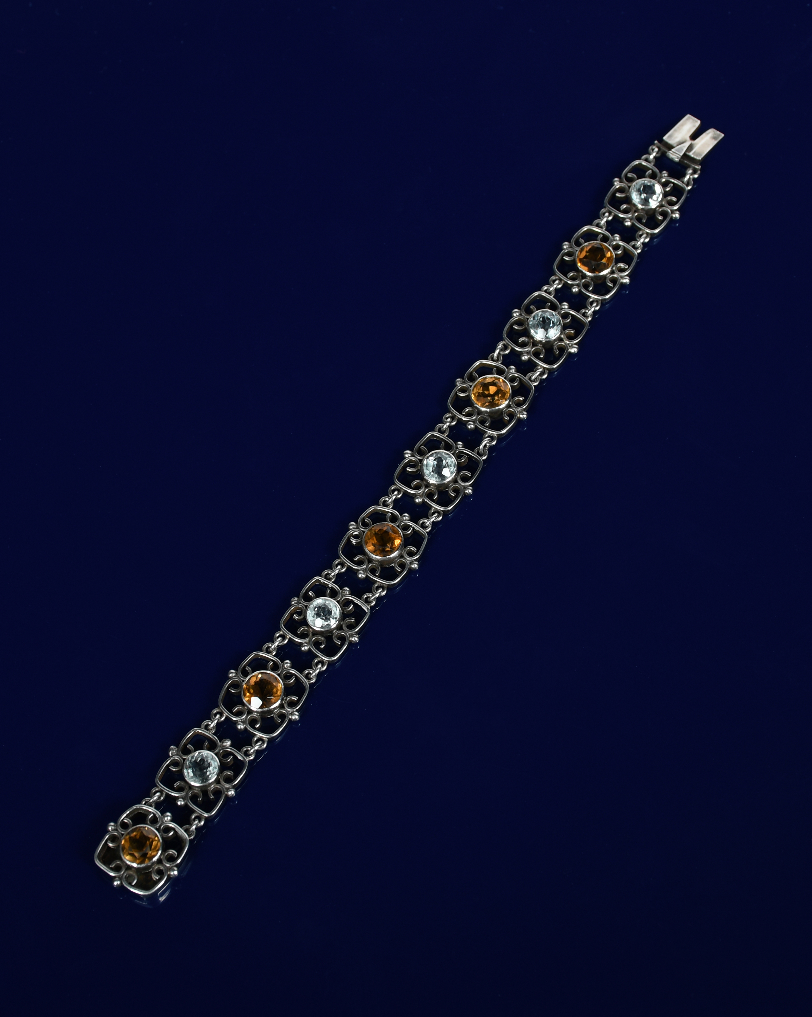 A silver link bracelet, square wirework links set with alternate citrine and aqua stones, unsigned, 17.5cm. long.