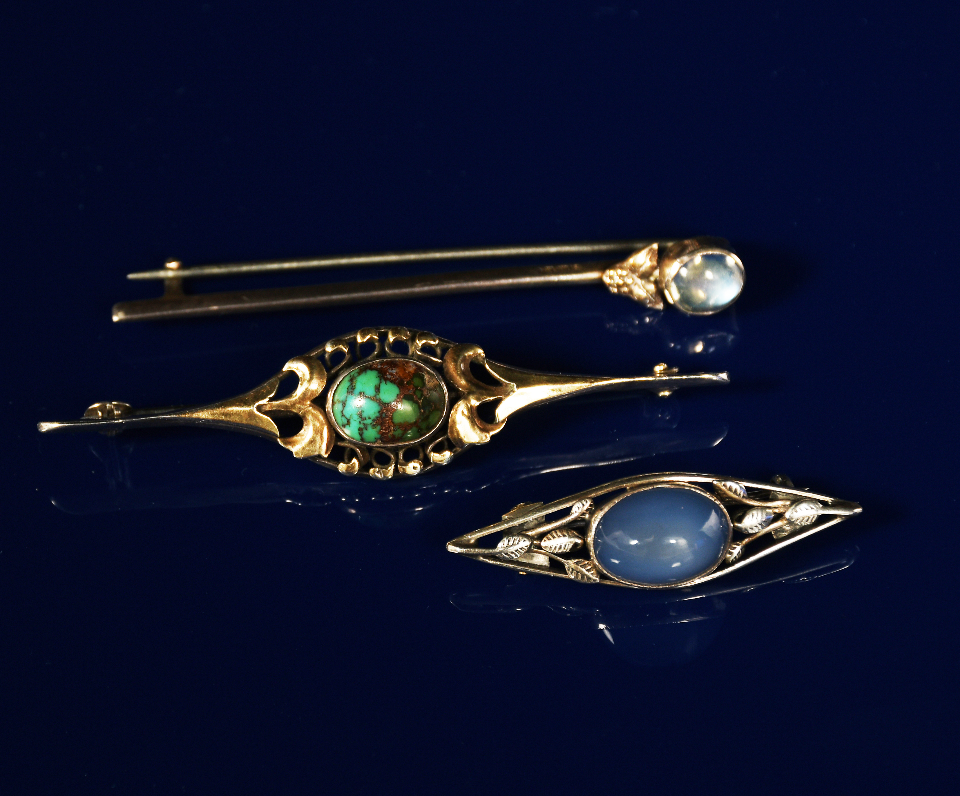 A Bernard Instone silver bar brooch, elliptical wirework frame with simple leaf panels, set with central chalcedony cabochon, a Bernard Instone turquoise matrix mounted bar brooch and another Bernard Instone bar brooch set with a moonstone, unsigned, 3.5cm. wide (3)