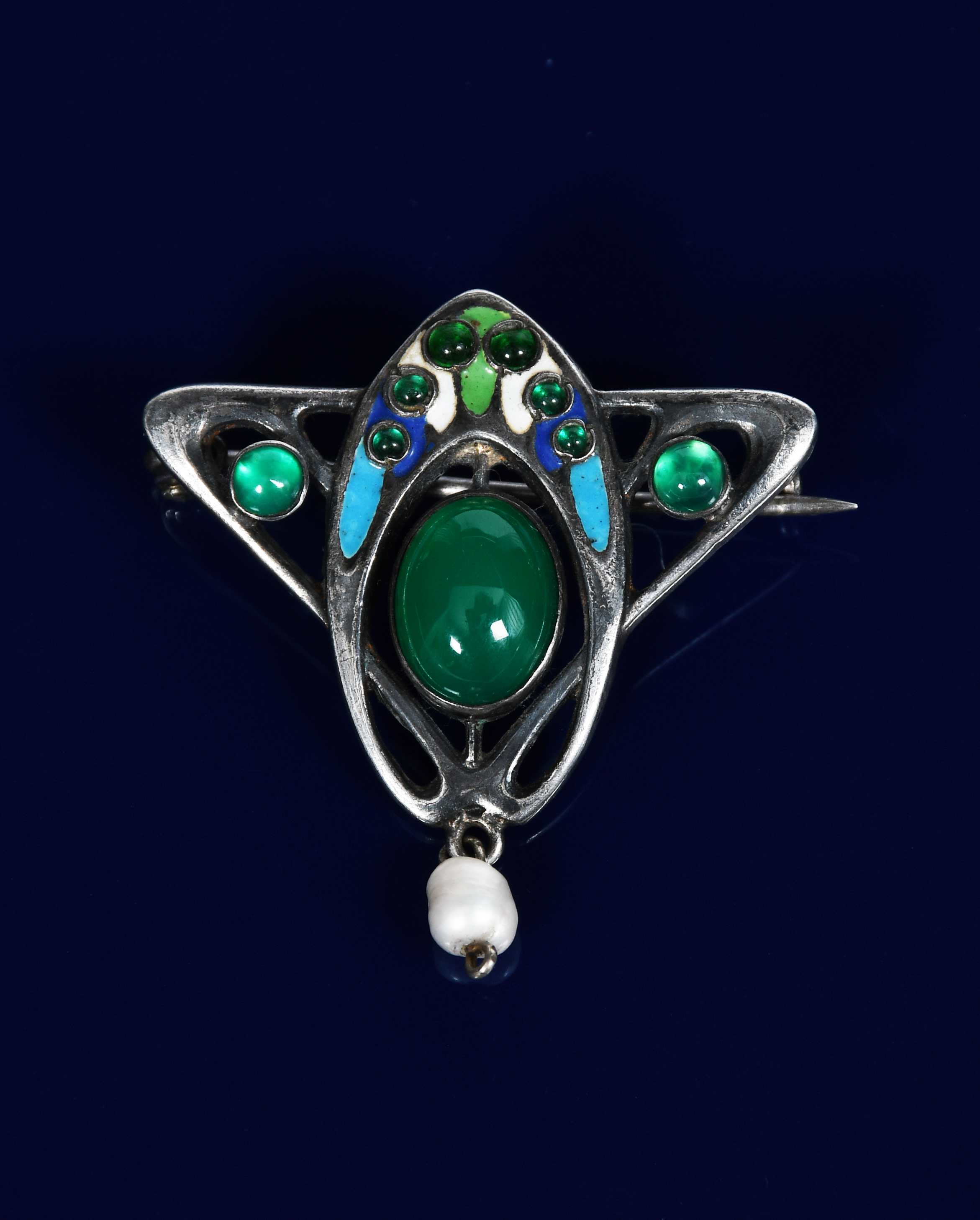 A continental Secessionist silver brooch in the manner of Theodore Fahrner, pierced wirework triangular frame with green, white and blue enamelled border, set with small green stones and central chrysoprase cabochon, with natural pearl drop unsigned, 3cm. wide.