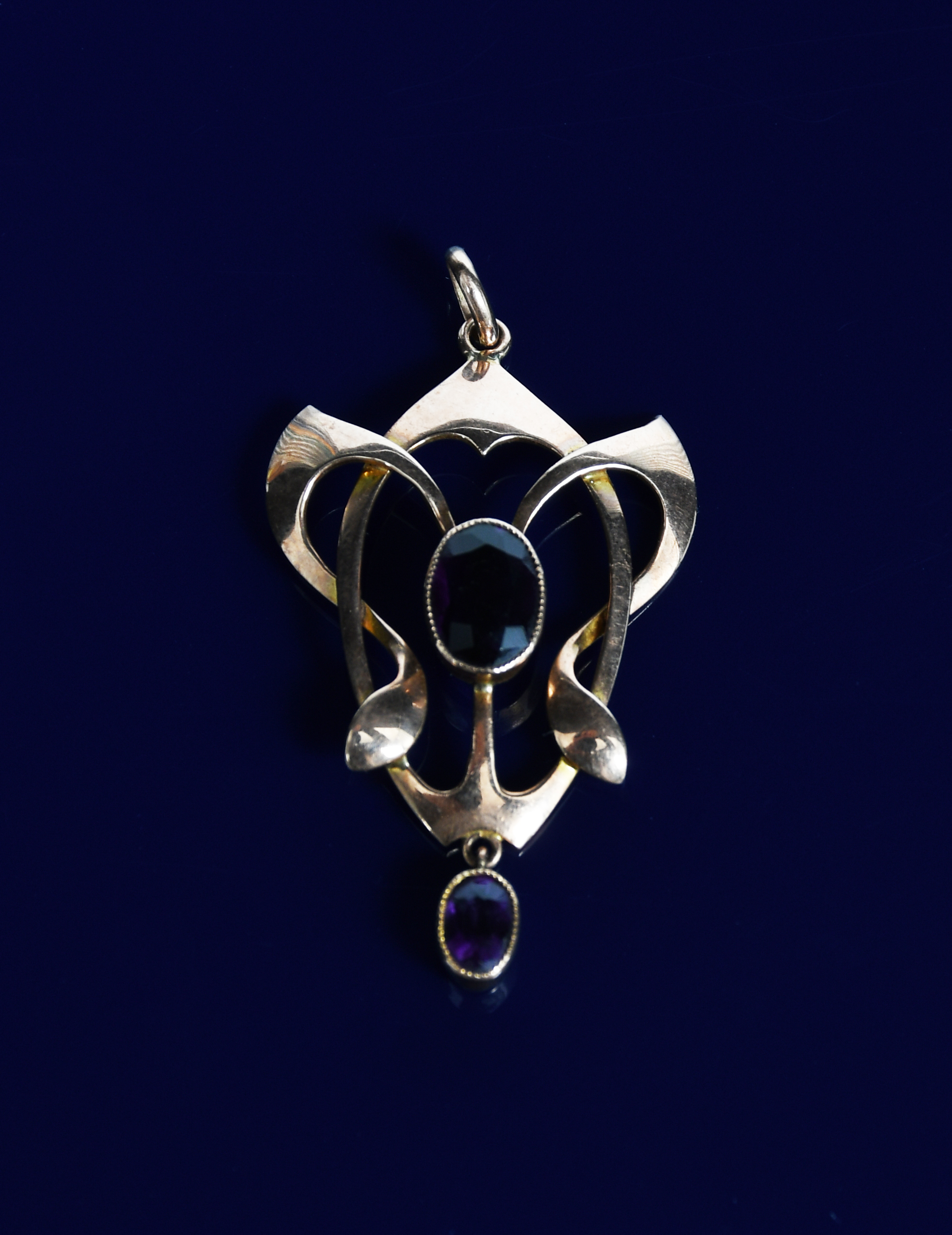 An Art Nouveau Barnet Henry Joseph gold pendant necklace, entwined wirework set with amethyst and amethyst drop, stamped BHJ 9ct, 4cm. drop