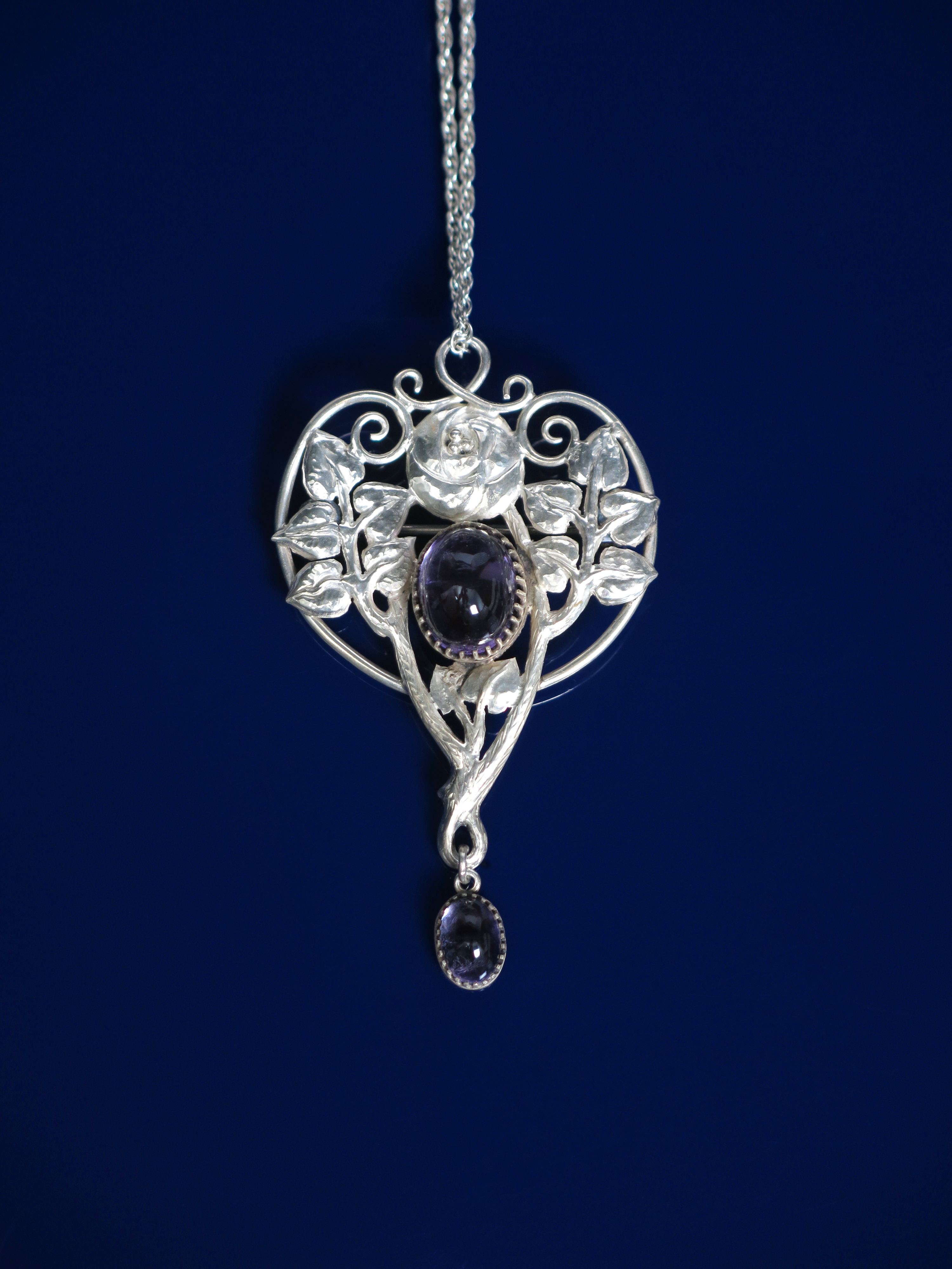 A Guild of Handicraft silver and amethyst pendant necklace, pierced and chased with a briar rose inside scroll border, set with central amethyst above amethyst drop, unsigned, 6.5cm. long