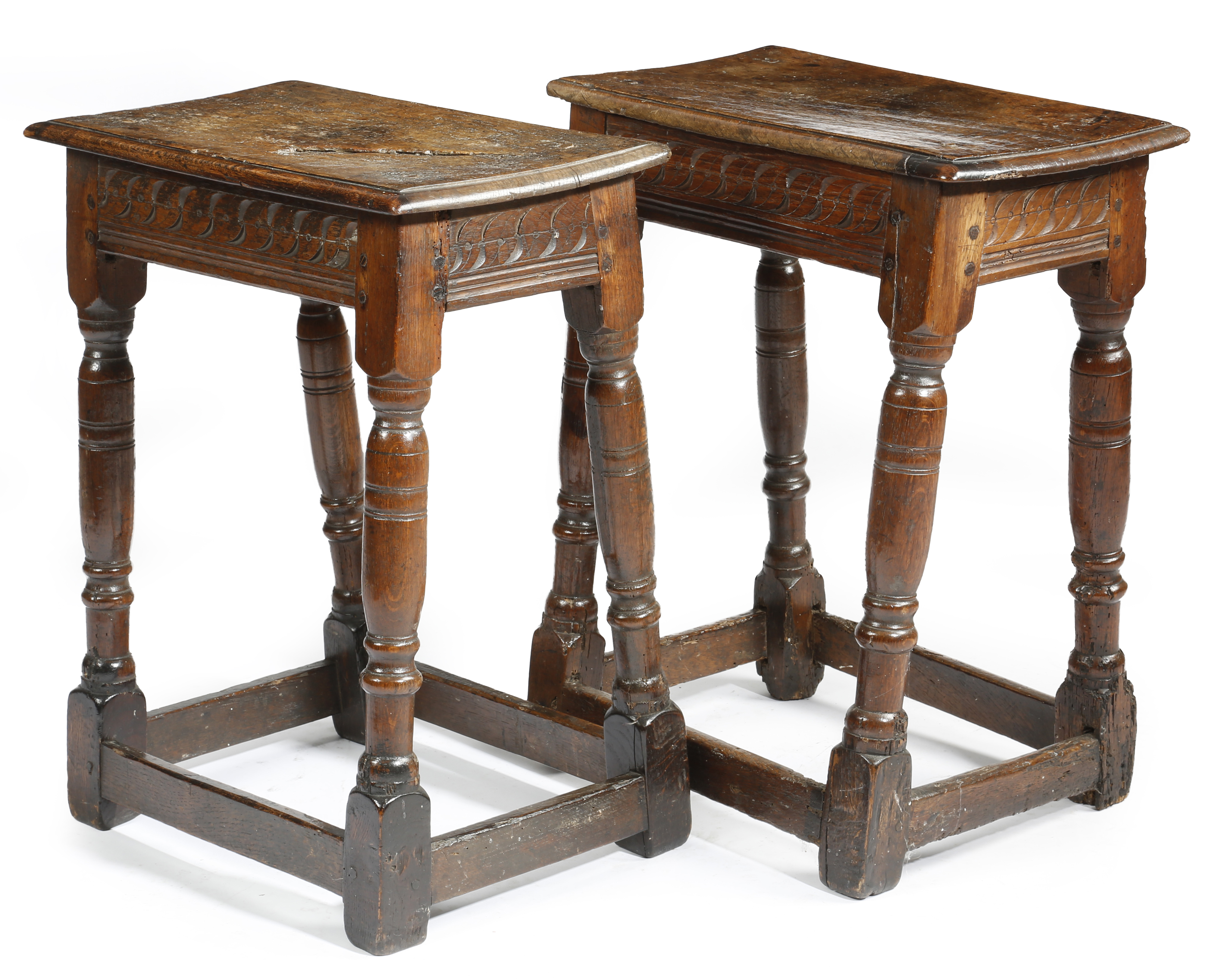A pair of Charles I oak joint stools attributed to Salisbury, each with a seat with a moulded edge above a chain carved and moulded frieze, on slender baluster and ring turned legs united by peripheral stretchers, 55.4cm high, 45cm wide, 26.6cm deep. (2)