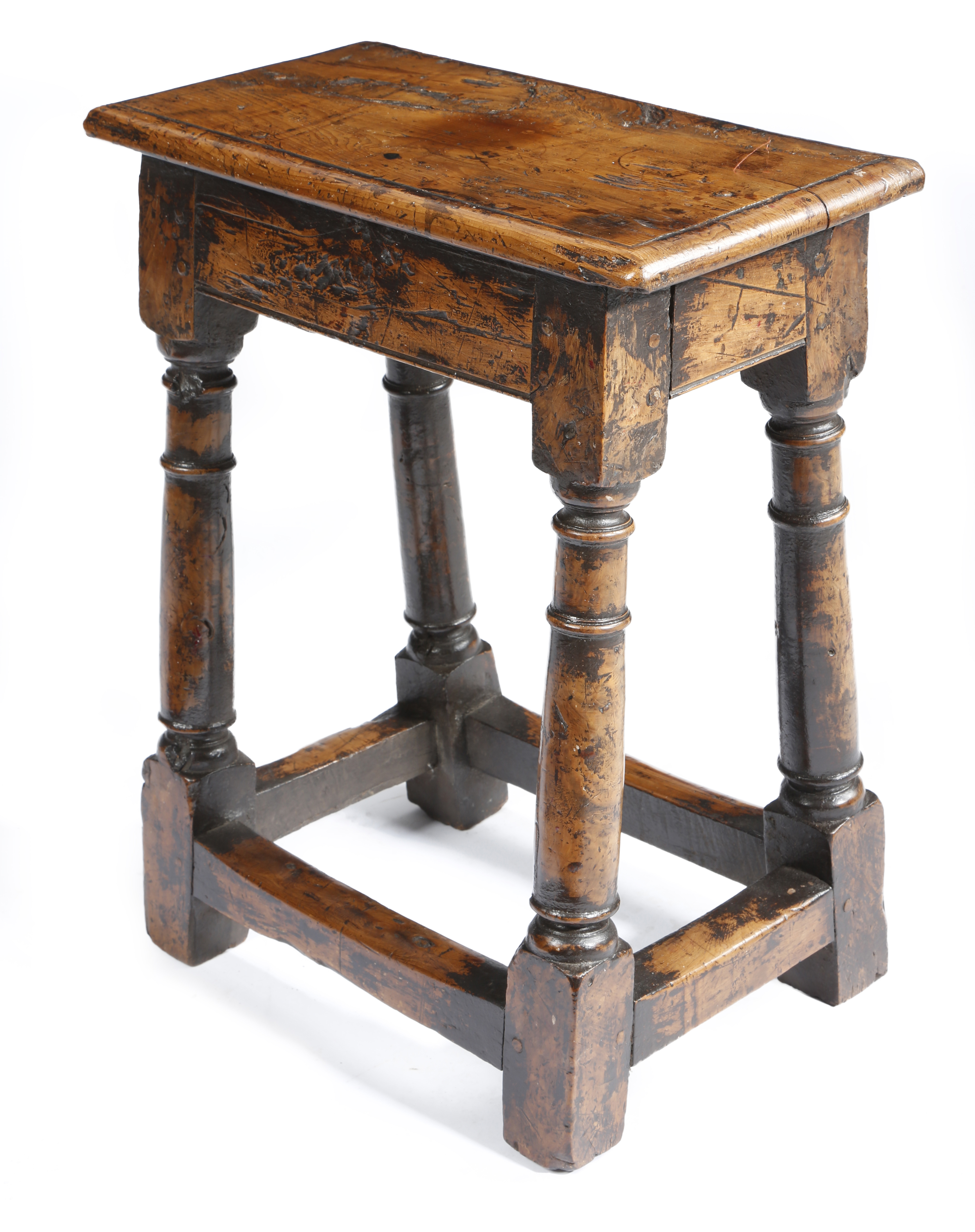 A rare mid-17th century yew joint stool, the seat with a moulded edge, above a plain frieze, on ring turned column legs united by peripheral stretchers, 49cm high, 40cm wide, 26cm deep.