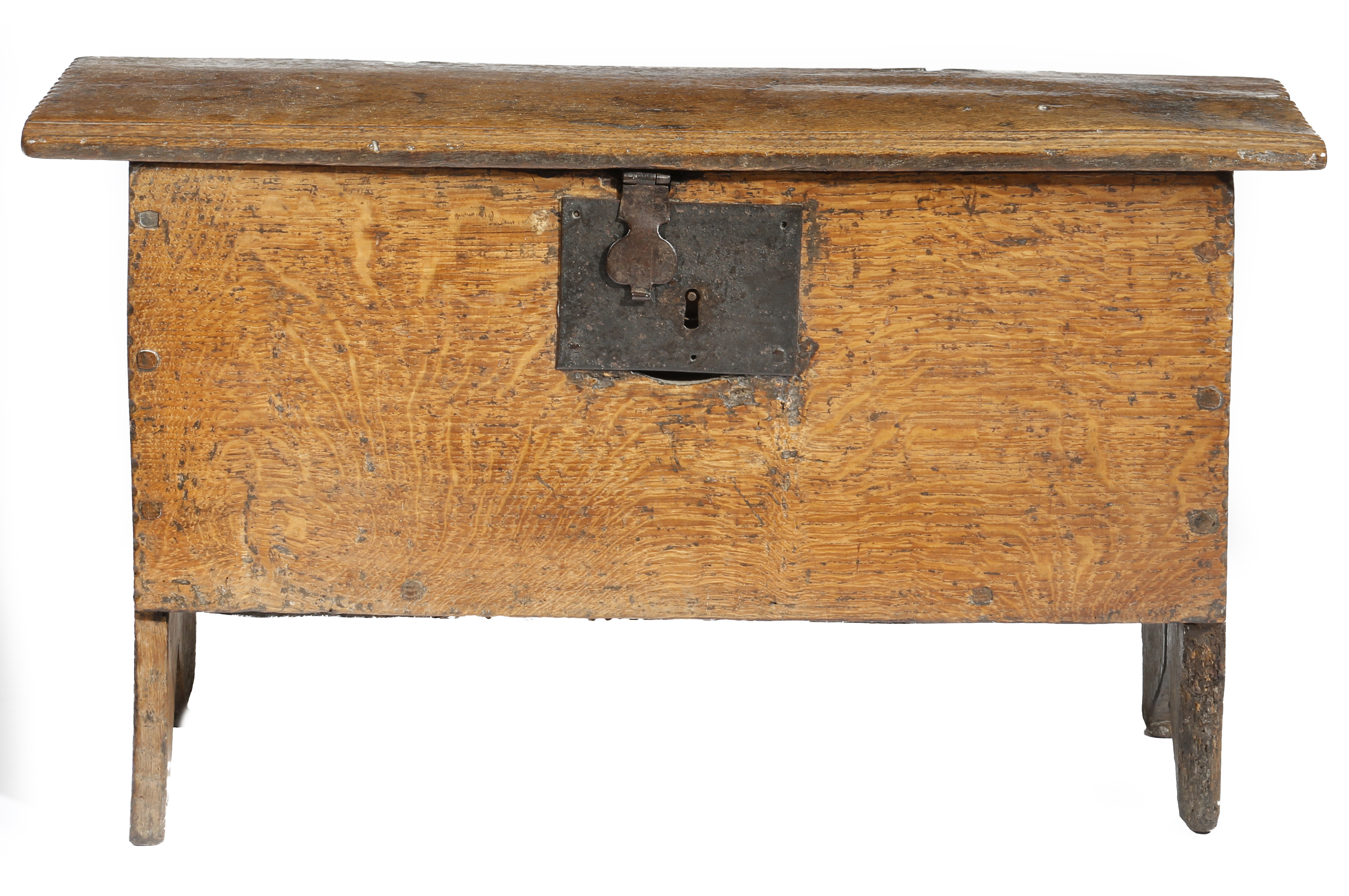 A small early 17th century oak boarded coffer, with thumbnail carved decoration, the lid with later hinges revealing a vacant interior, on cut-out ends, 39.8cm high, 68cm wide, 29cm deep.