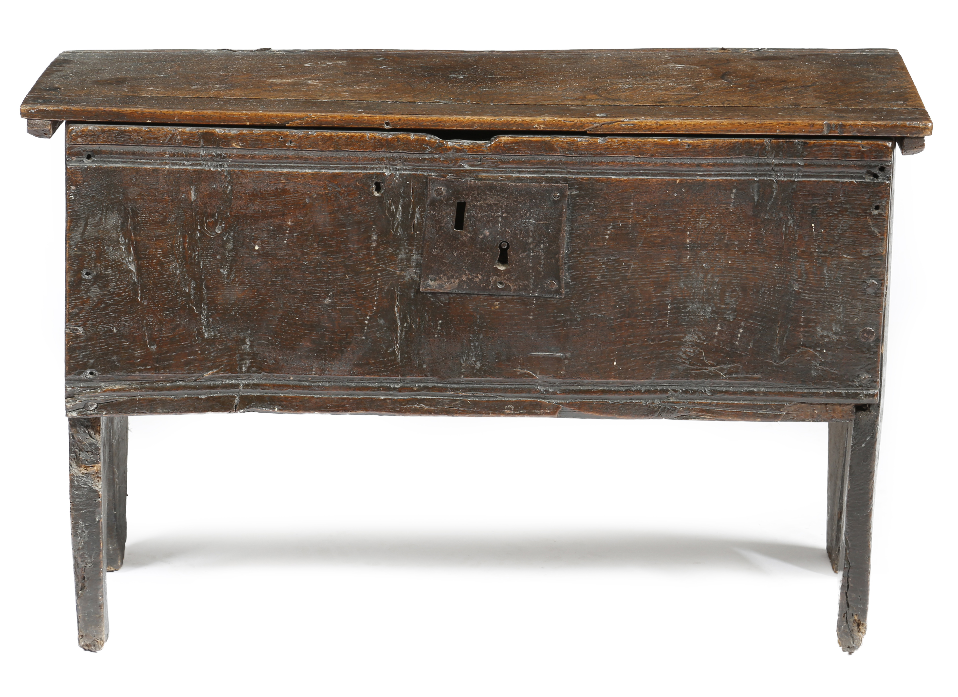 A small early 17th century oak boarded coffer, the hinged lid revealing an open till, on cut-out ends, 41.5cm high, 66.8cm wide, 28.8cm deep.