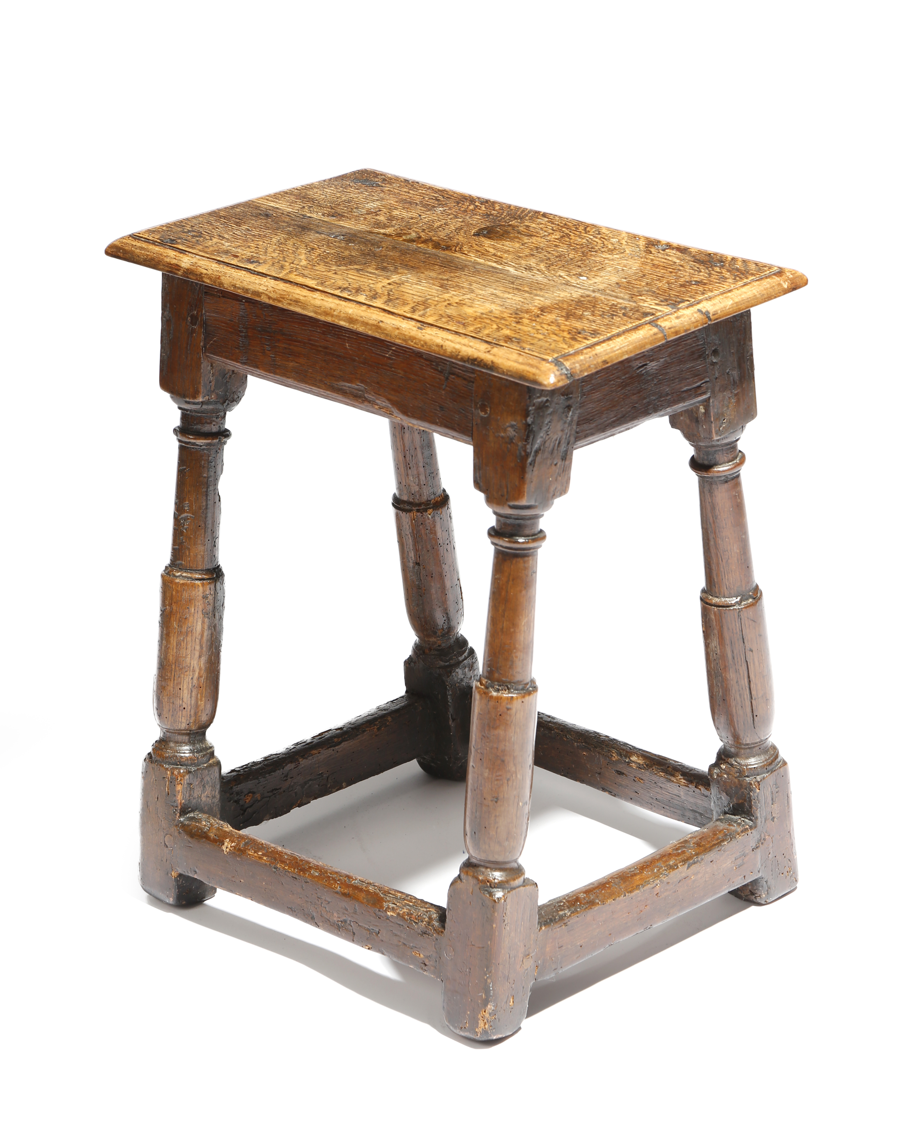 A 17th century oak joint stool, the later seat on turned legs united by peripheral stretchers, 52.4cm high, 46.3cm wide, 33.8cm deep.