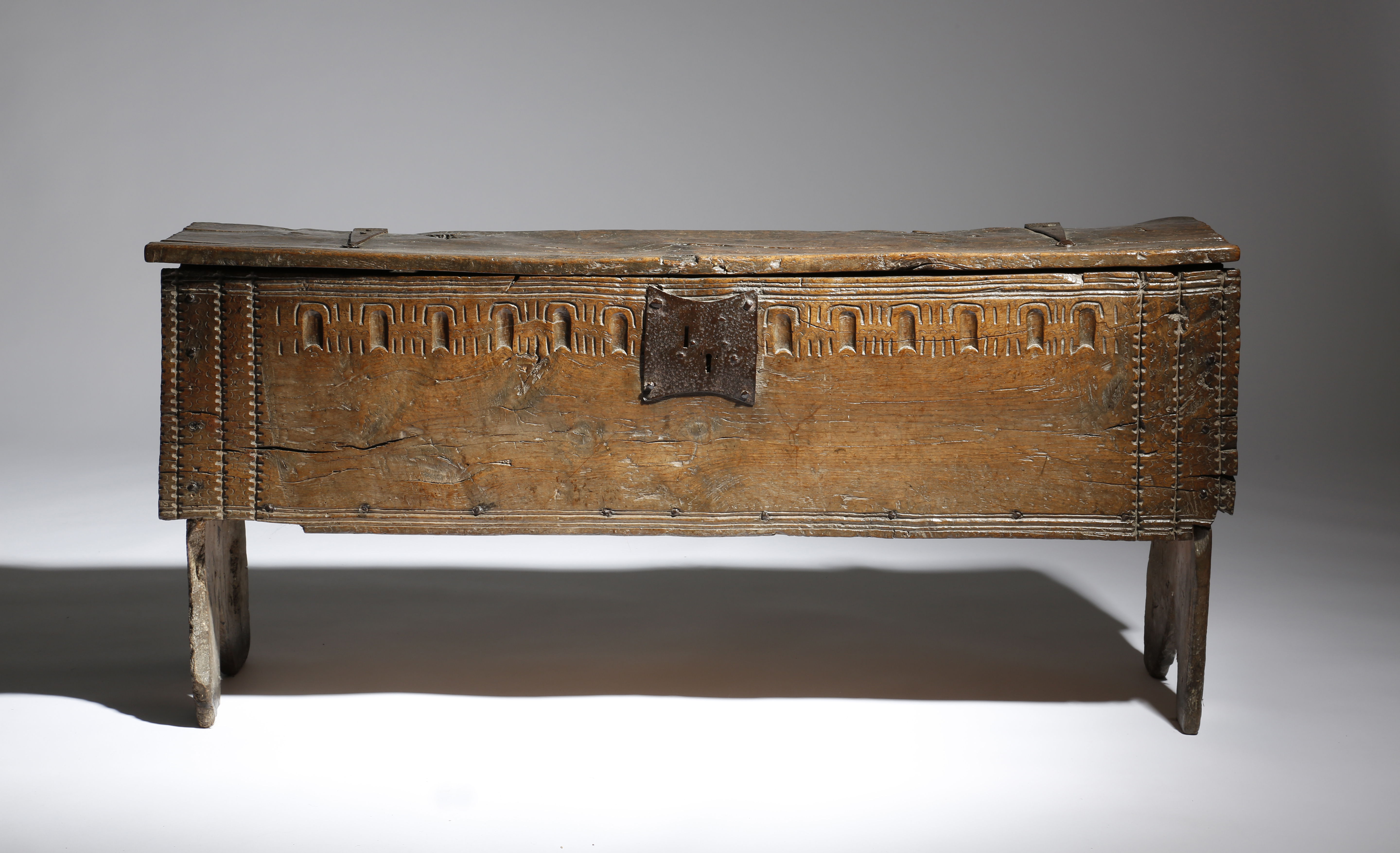 An Elizabeth I oak boarded coffer, the top with iron hinges, a moulded edge and crimped ends, revealing a vacant interior, the front with a thumbnail frieze and crimped bands, on cut-out ends, late 16th century, 57.2cm high, 126.7cm wide, 31.2cm deep.