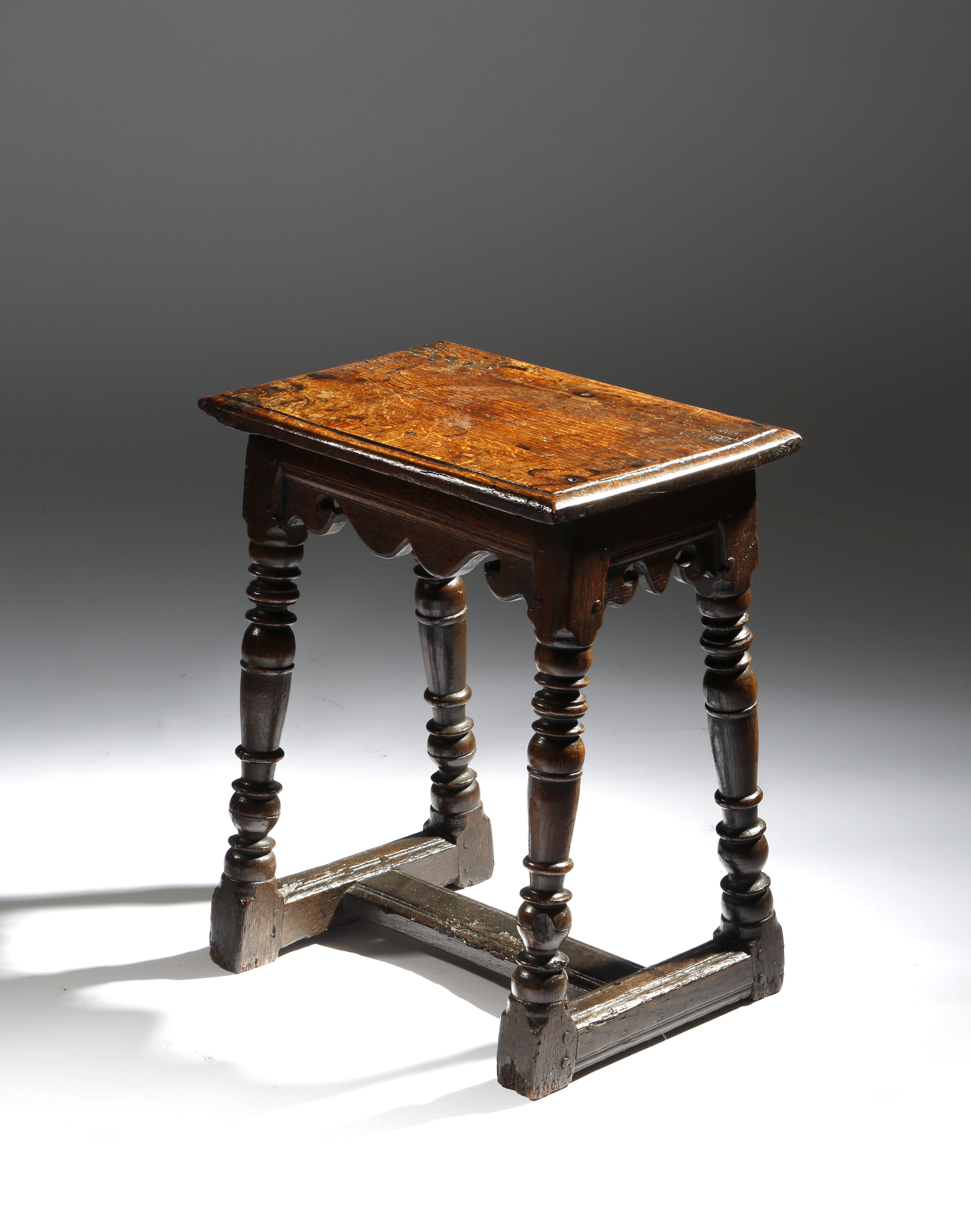 A rare Charles I oak joint stool, the seat with a moulded edge, above a moulded frieze with bicuspid rails and elaborately turned legs united by a flat 'H' stretcher, probably West Country, 54.1cm high, 44.2cm wide, 32cm deep.