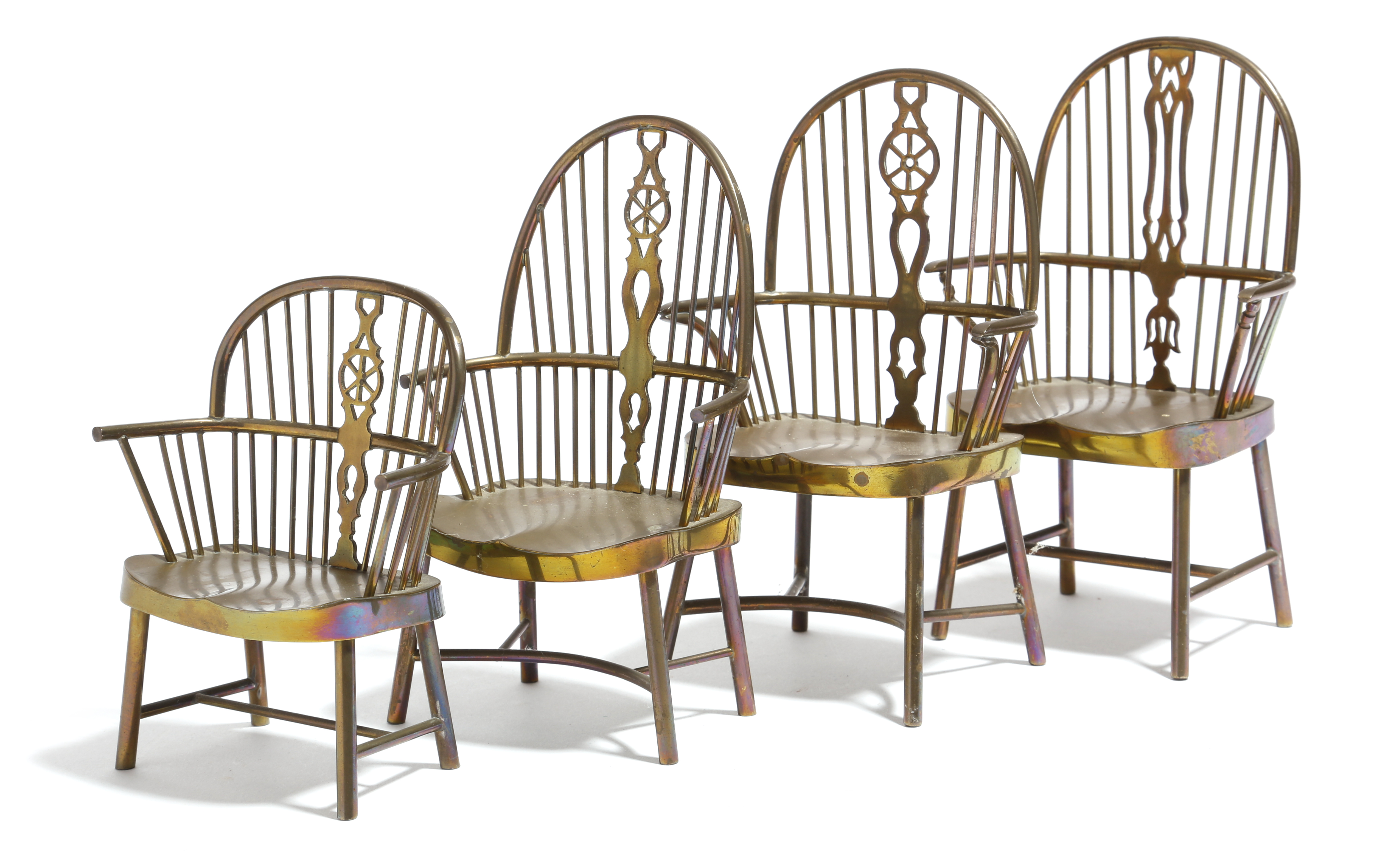 Four brass miniature models of Windsor armchairs, two with paper labels with dates of manufacture and signed in pen 'ROWLY BROWN', late 20th century, 15.7cm high. (4)