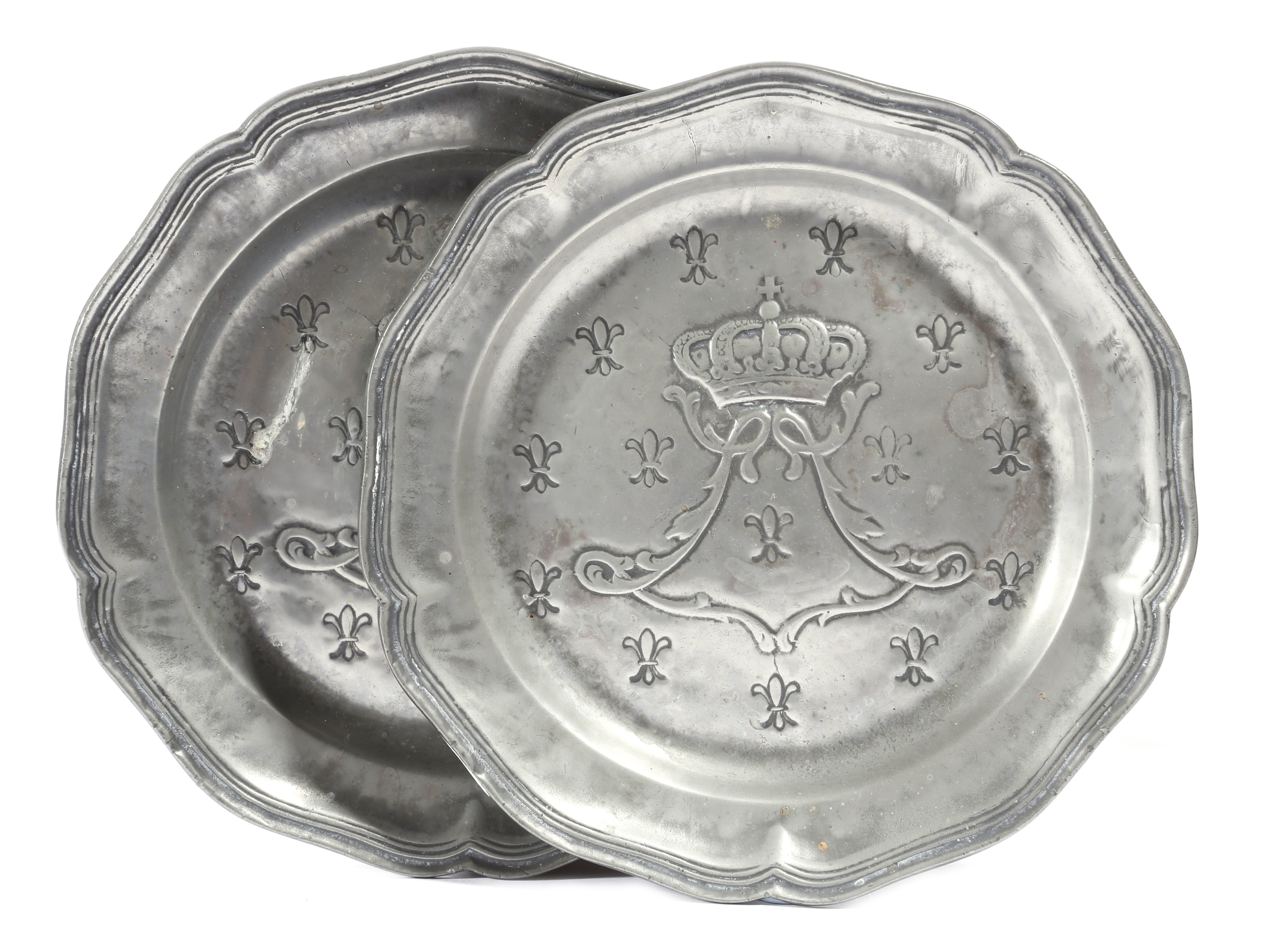 A pair of scalloped pewter plates, with moulded rims, the centres decorated with a crown and with multiple fleur-de-lis motifs, with rosette and crown marks and angel touchmarks, 23cm wide. (2)