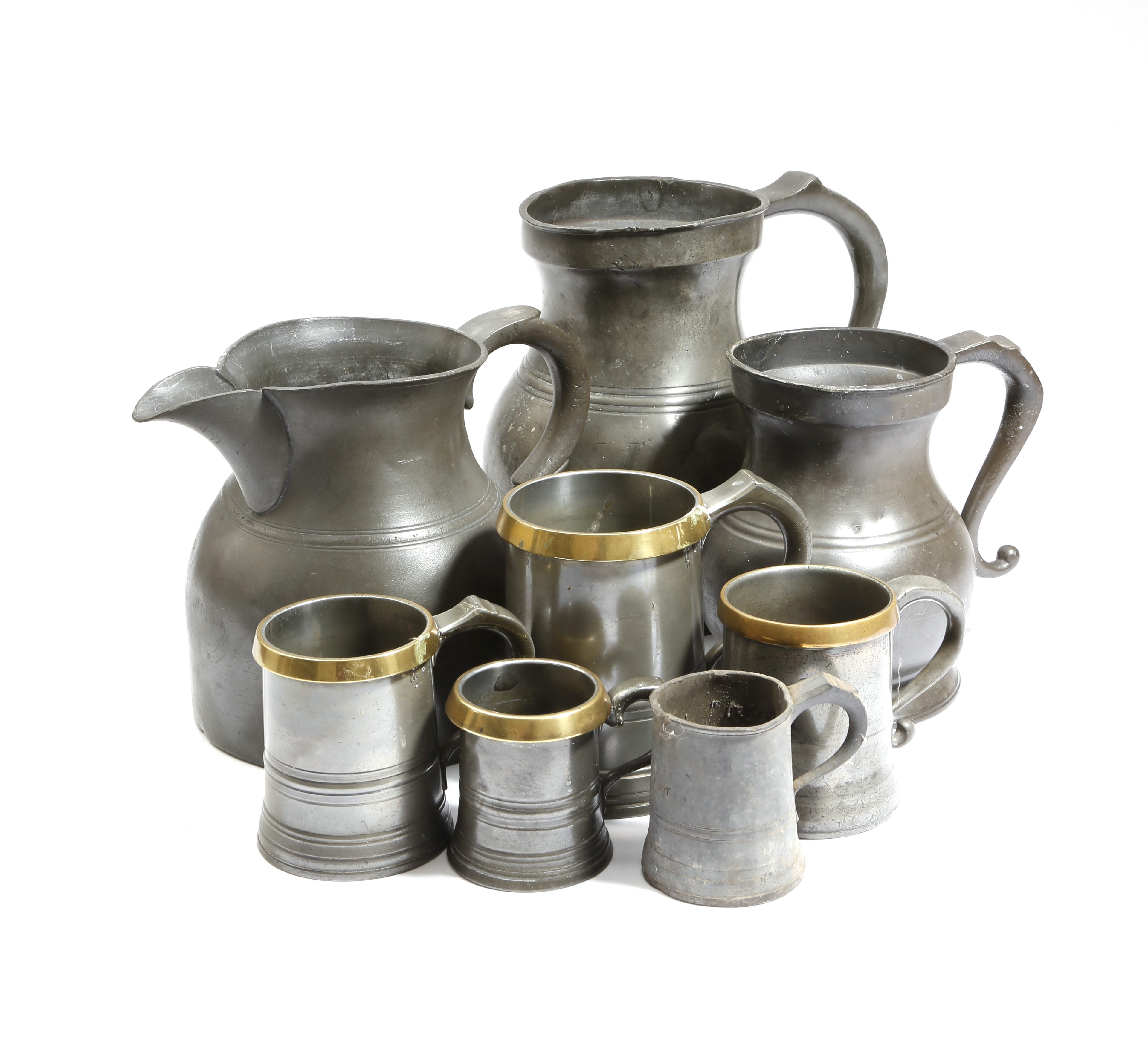 An 18th century pewter gallon baluster measure, with a scroll handle, marked 'GALLON' with a 'Crown 28' mark, 26.4cm high, together with seven other pewter measures, three with brass rims. (8)