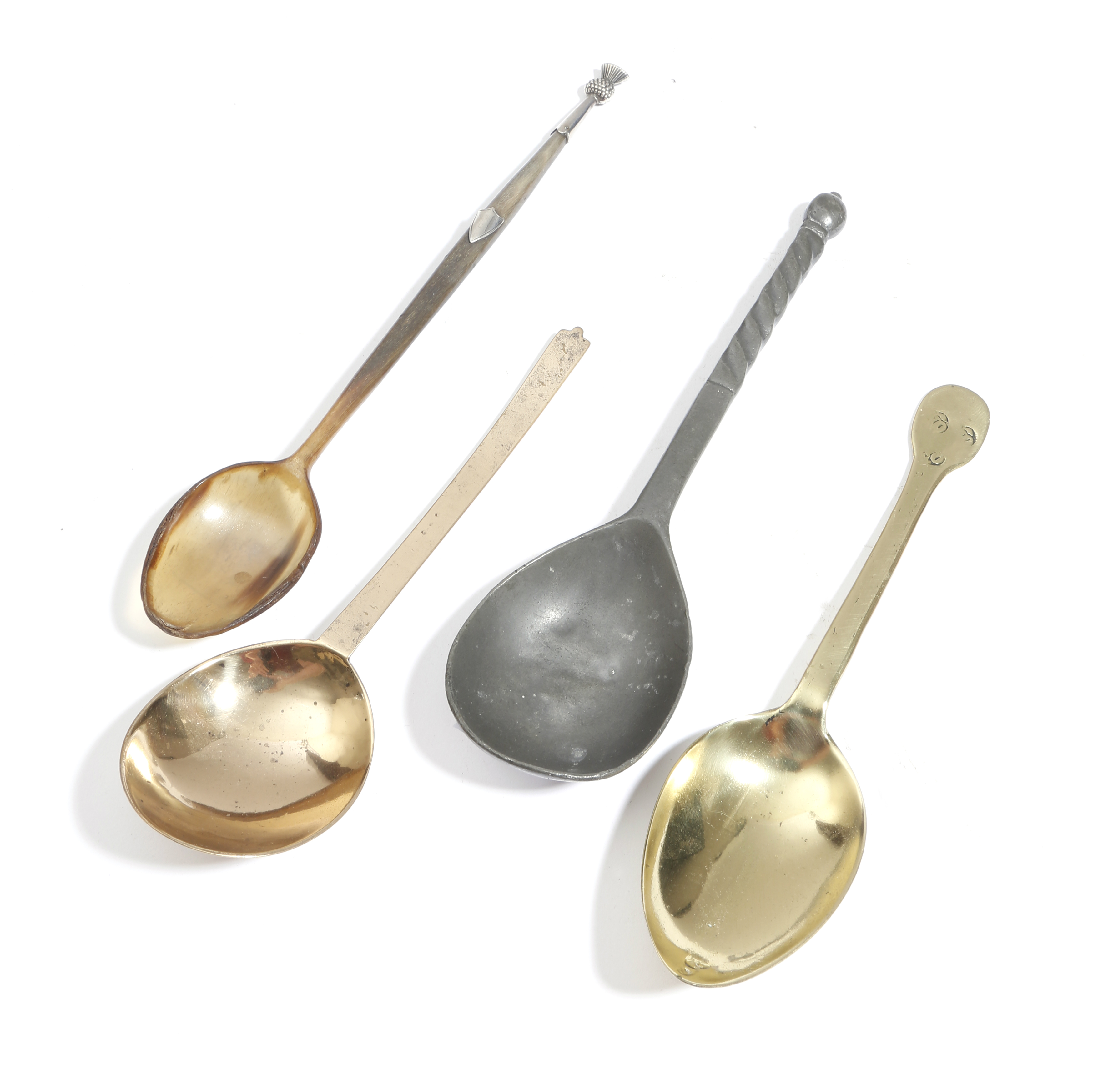 A George III Scottish horn and silver mounted spoon, with a thistle end and a vacant shield shape plaque, together with a latten spoon with a dog nose end a pewter spoon, with a part spiral fluted handle, the bowl stamped with 'X N R' and a brass example, 20.1cm long (max). (4)