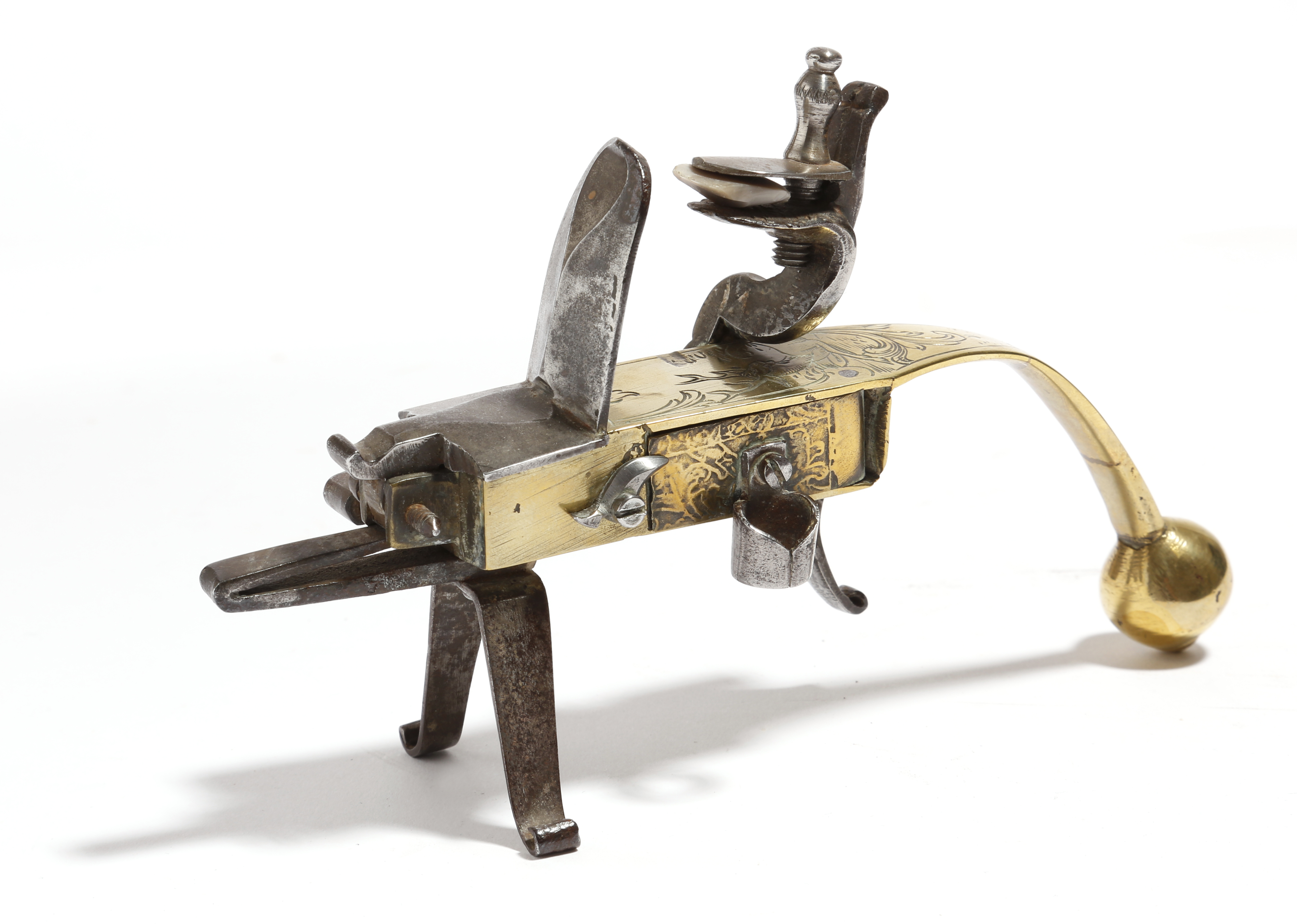 An 18th century brass and steel flintlock tinder pistol lighter, the handle engraved with a recumbent stag and scrolls, 19cm long.