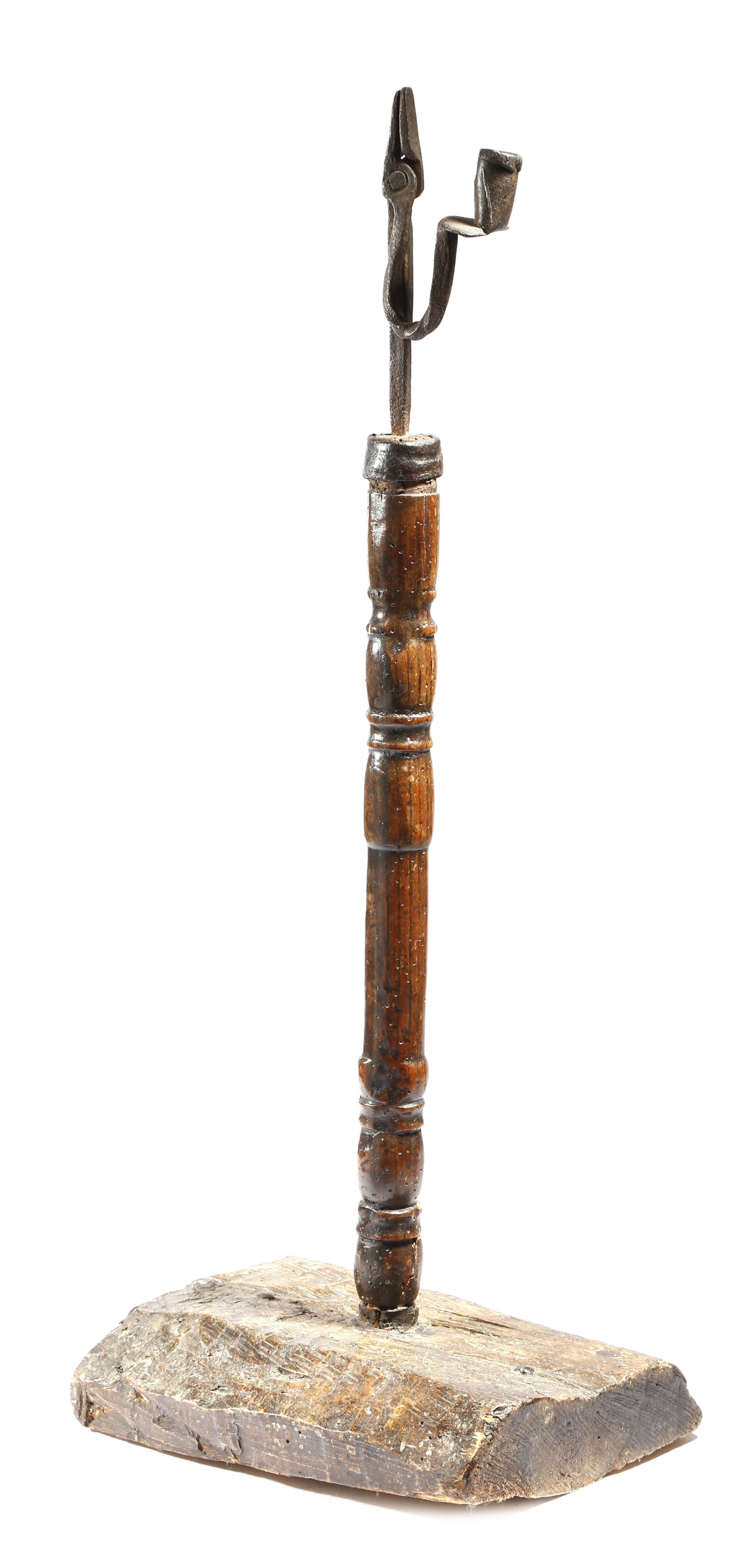 An 18th century wrought iron rushnip and candle holder, mounted on an elm bobbin and ring turned stem, with a rustic wood base, 63.7cm high.