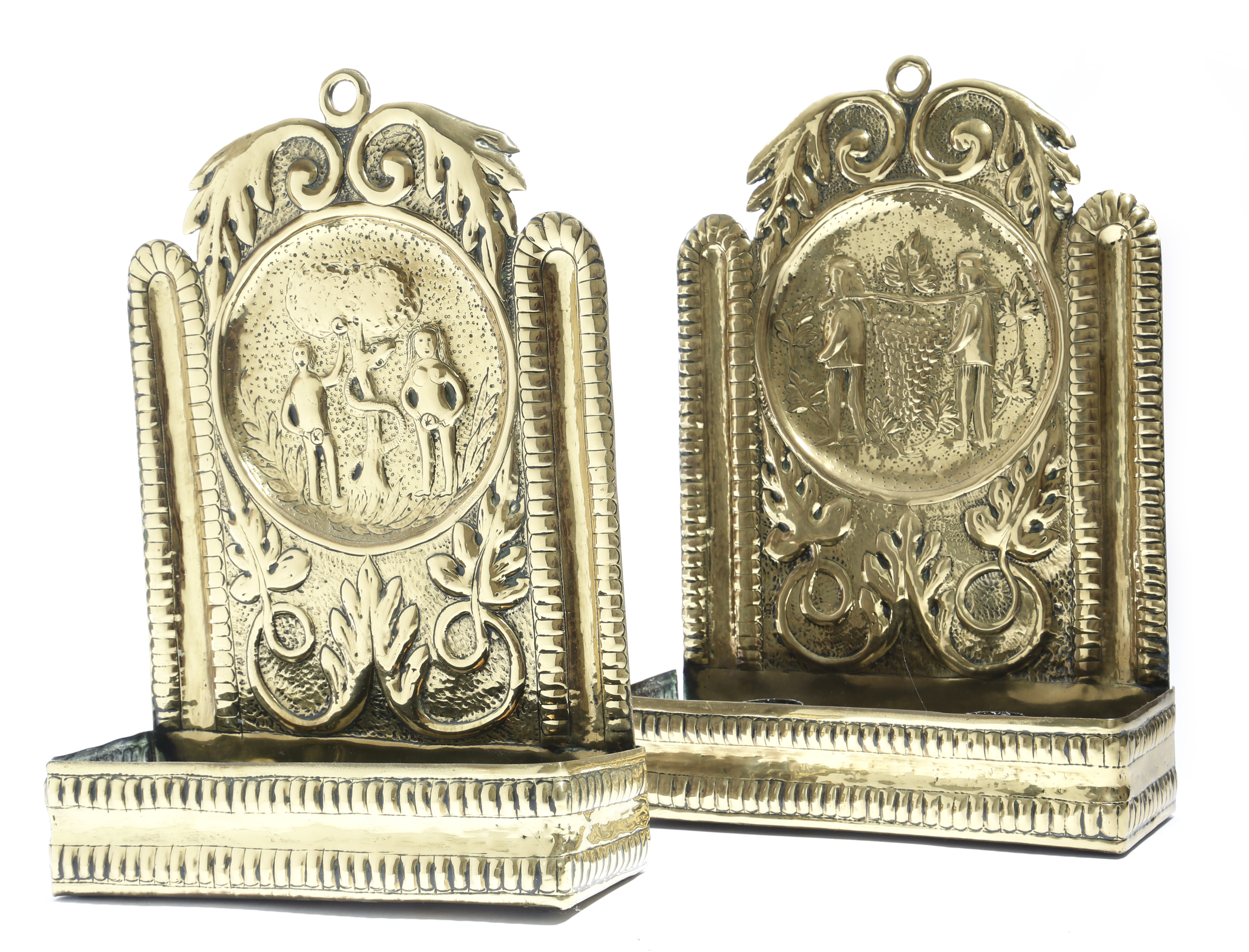 A pair of Dutch sheet brass wall sconces, each with a repoussé scrolling leaf back centred with a rondel decorated with two grape pickers and Adam and Eve, the base with twin lights, 19th century, 31.8cm high, 22.5cm wide. (2)