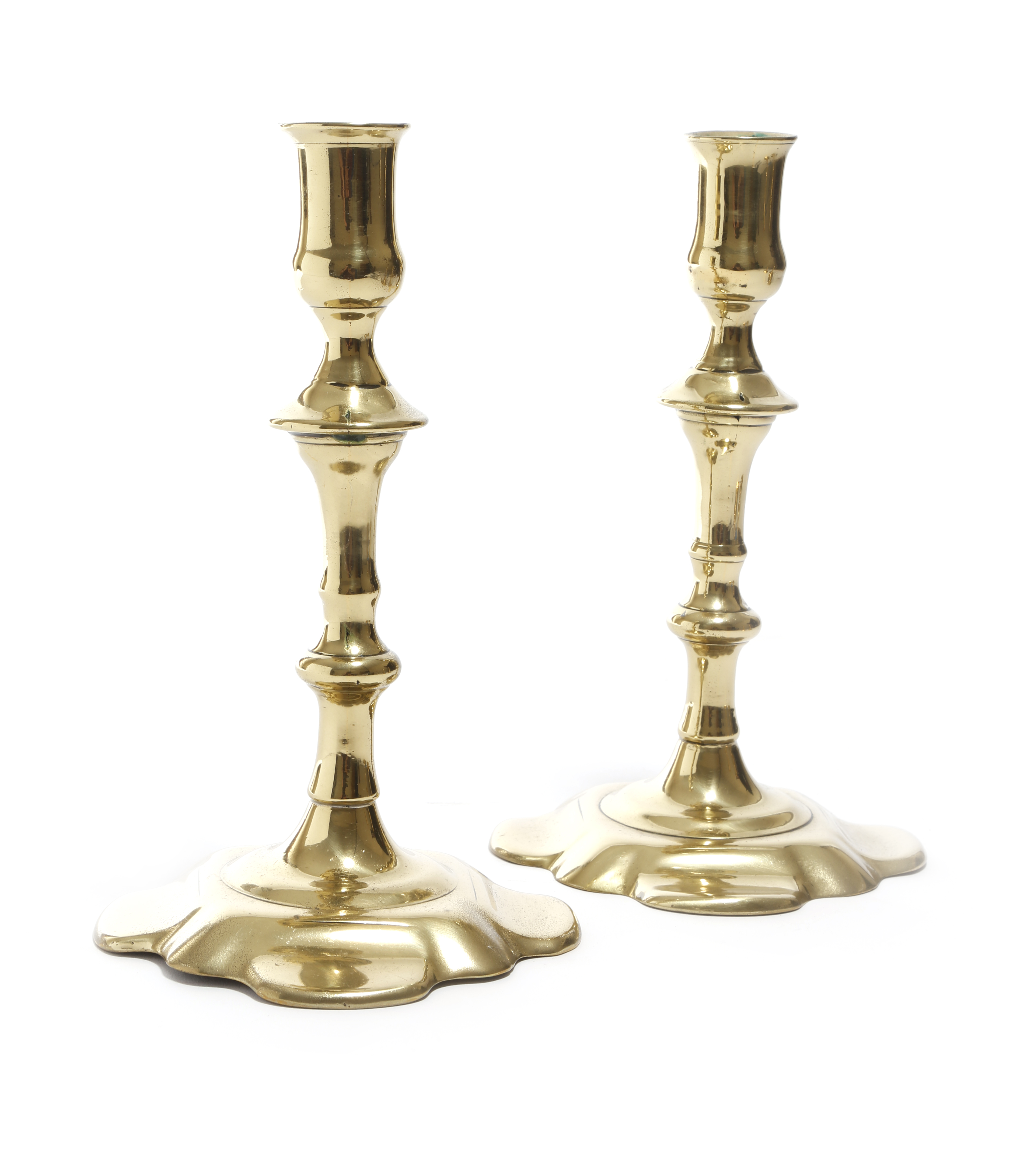 A pair of George II candlesticks, each with a knopped stem and a petal foot, the underside of each stamped with owner's triad initials 'S over RS', 20.8cm high. (2)