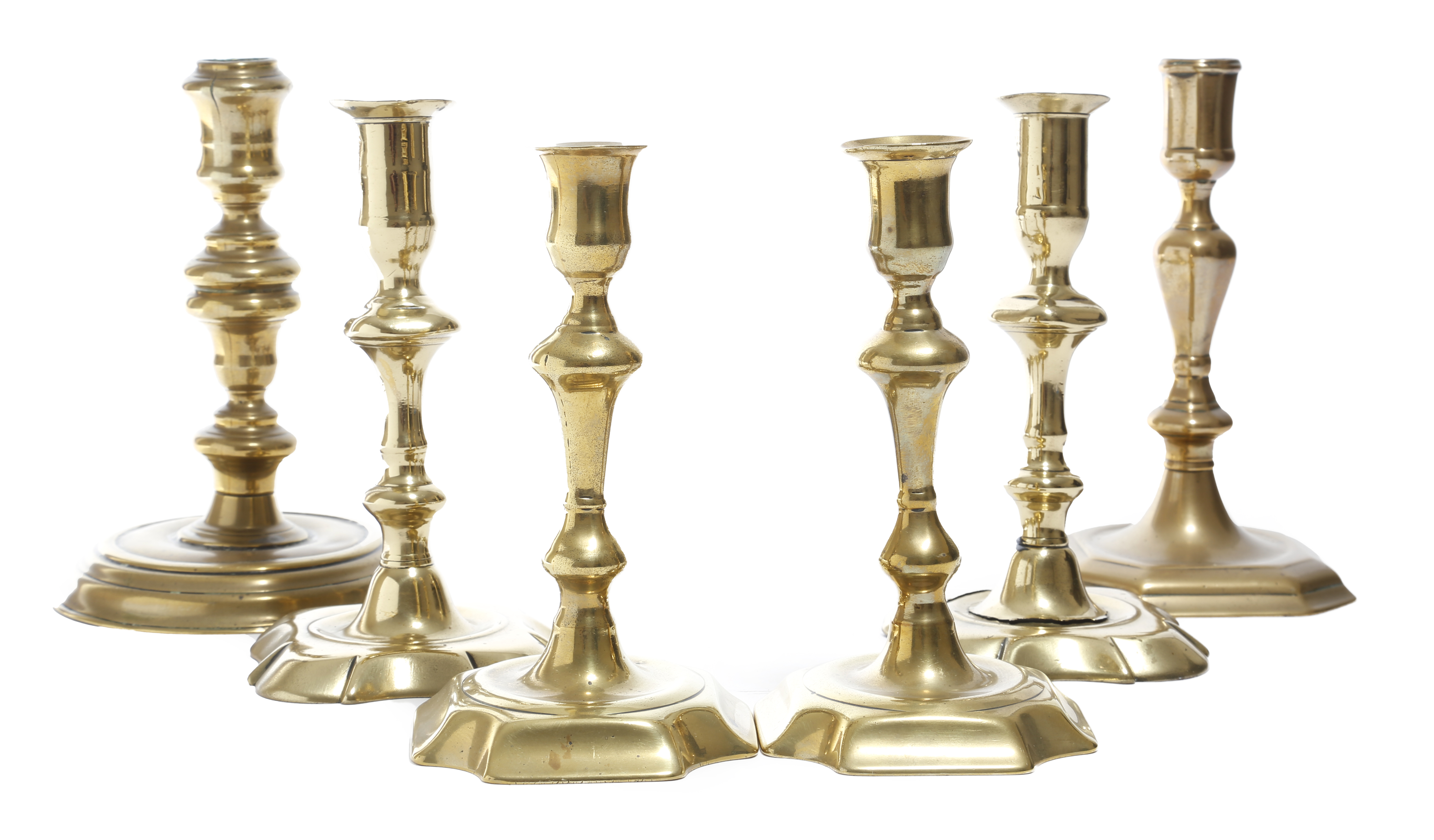 Two pairs of George II brass candlesticks, each with a knopped stem, together with a Queen Anne candlestick, with a turned baluster stem and an early George II candlestick, 18.3cm high (max). (6)