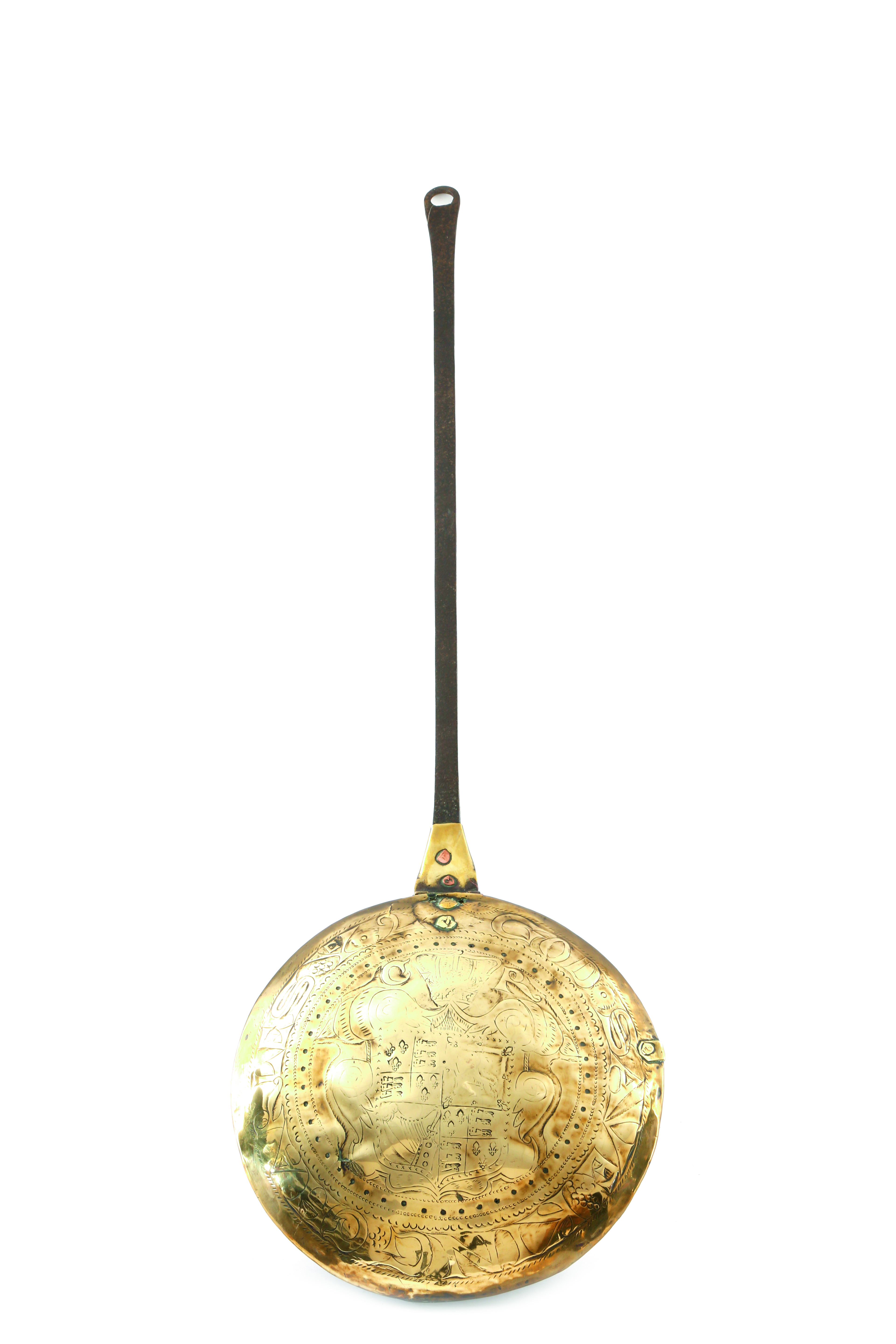 A Charles II brass warming pan, with an iron handle and a pierced hinged lid, the centre engraved with the Royal Coat of Arms and initials 'C R', and inscribed 'GOD SAVE KING CHARLES 2', 103.5cm long.