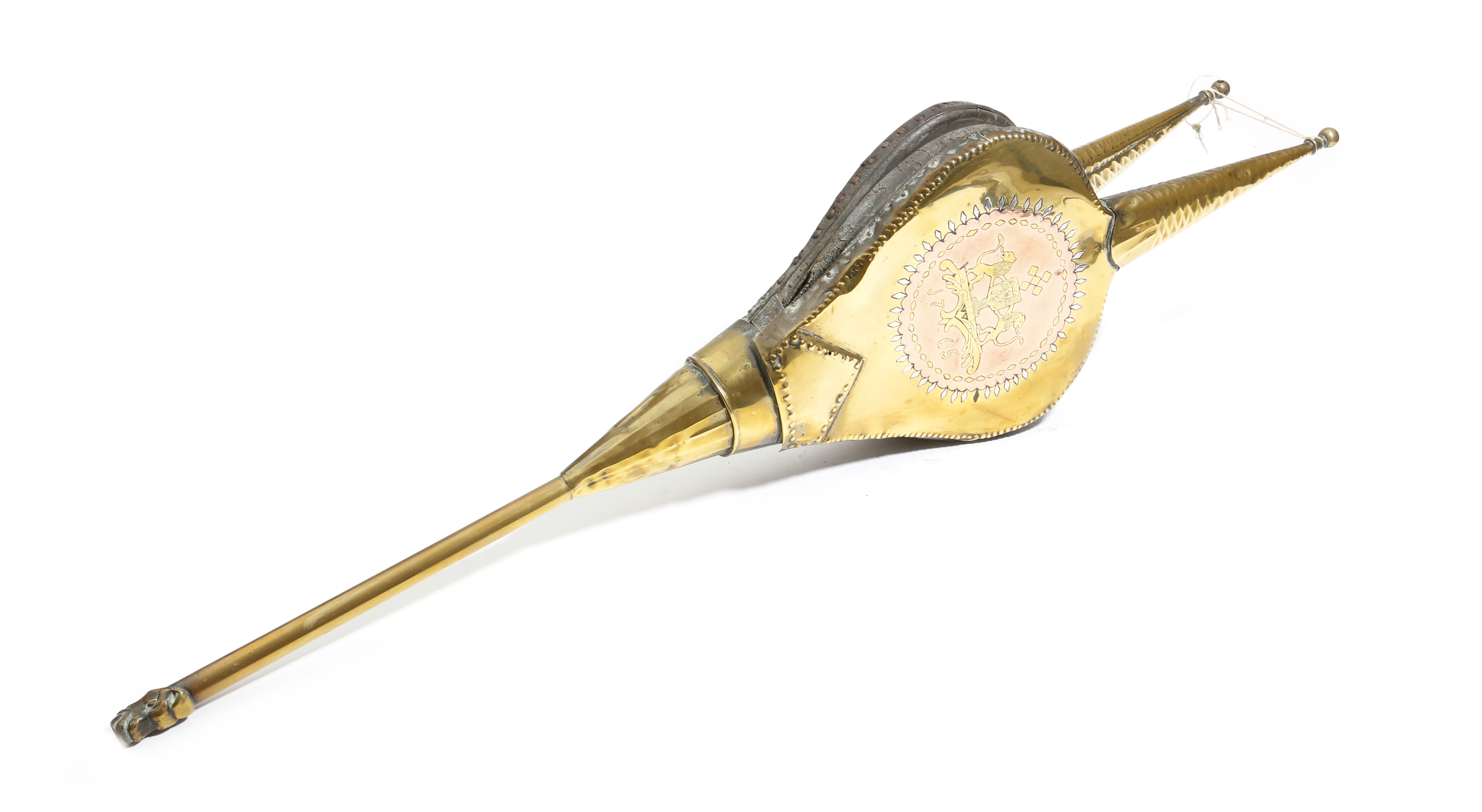 A large pair of George III brass bellows, inlaid with a copper panel with a pair of lions supporting a coat of arms and the date '1765', with a beast's head terminal, 85cm long.