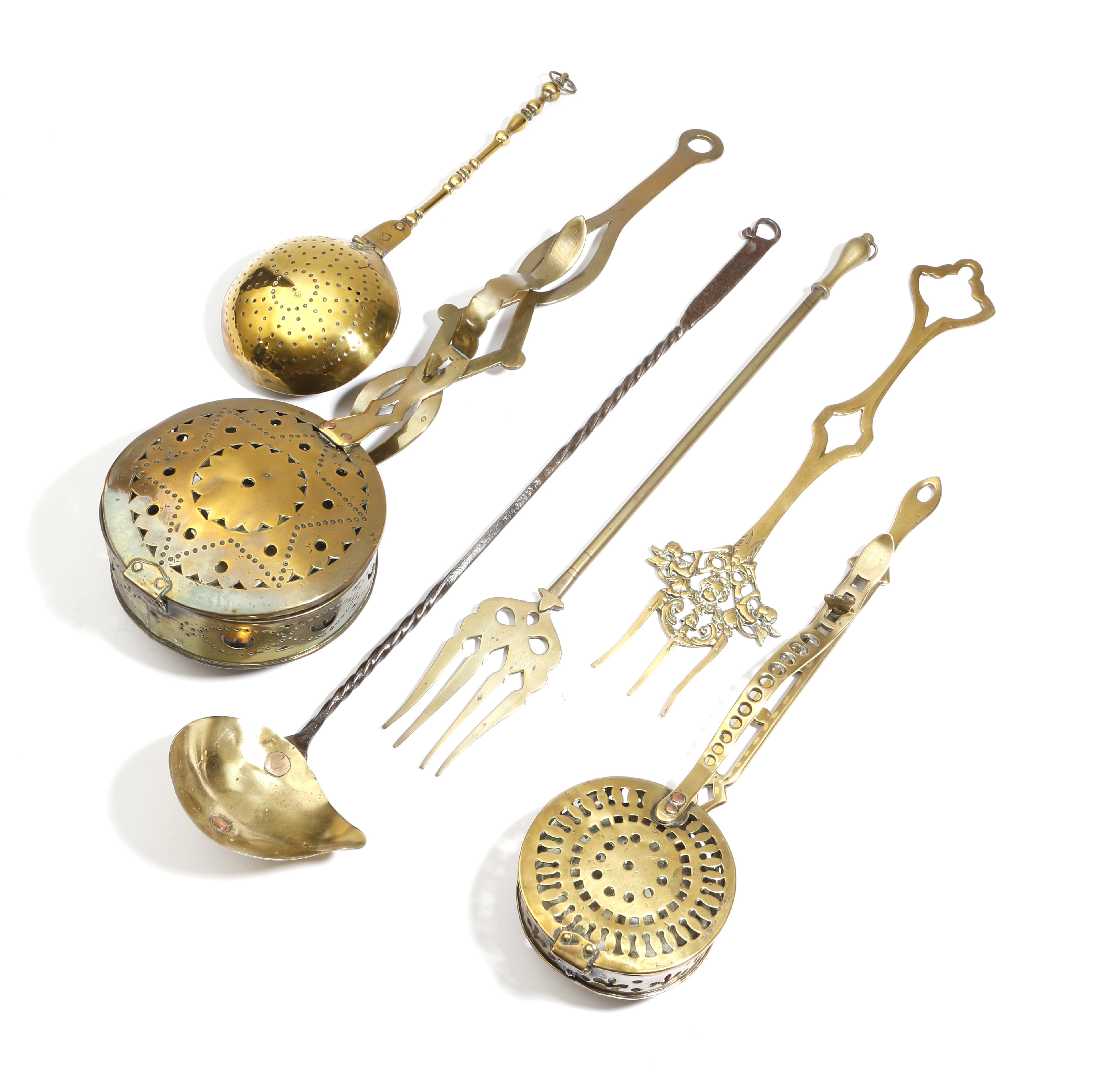 Three brass chestnut roasters, with pierced decoration and hinged lids, one 18th century with a turned handle, the largest stamped with a registration number '545964', together with two brass toasting forks and a brass ladle with a wrought iron handle, 60.5cm long. (6)
