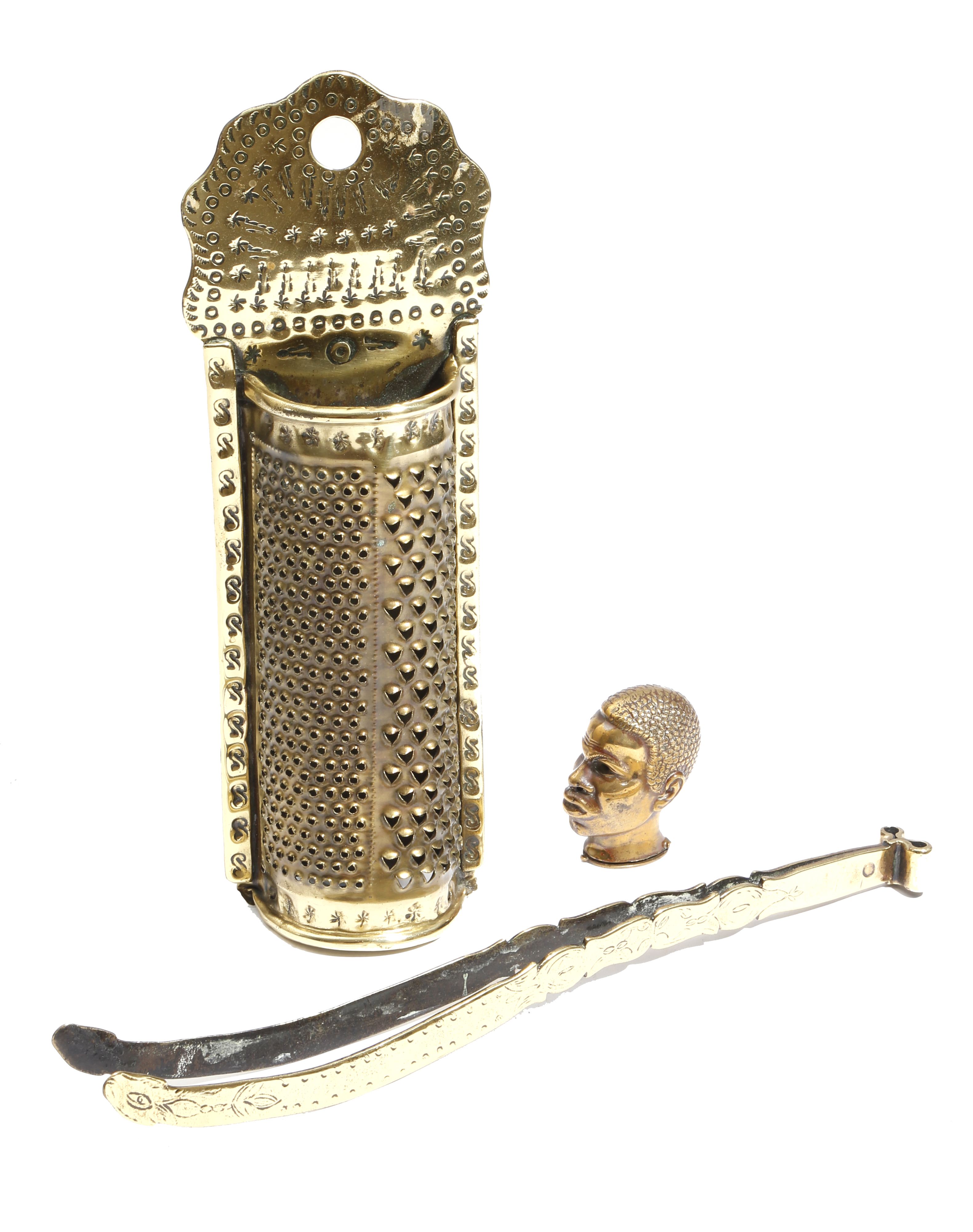 A pair of George III brass ember tongs, engraved with a beast's head, with leaves and initials 'T. M.' and with a bow end, together with a brass grater, with punched decoration, pierced with a hole for suspension and a brass vesta case, in the form of an African man's head, the hinged striking lid stamped 'REPONIST', 27cm (max). (3)