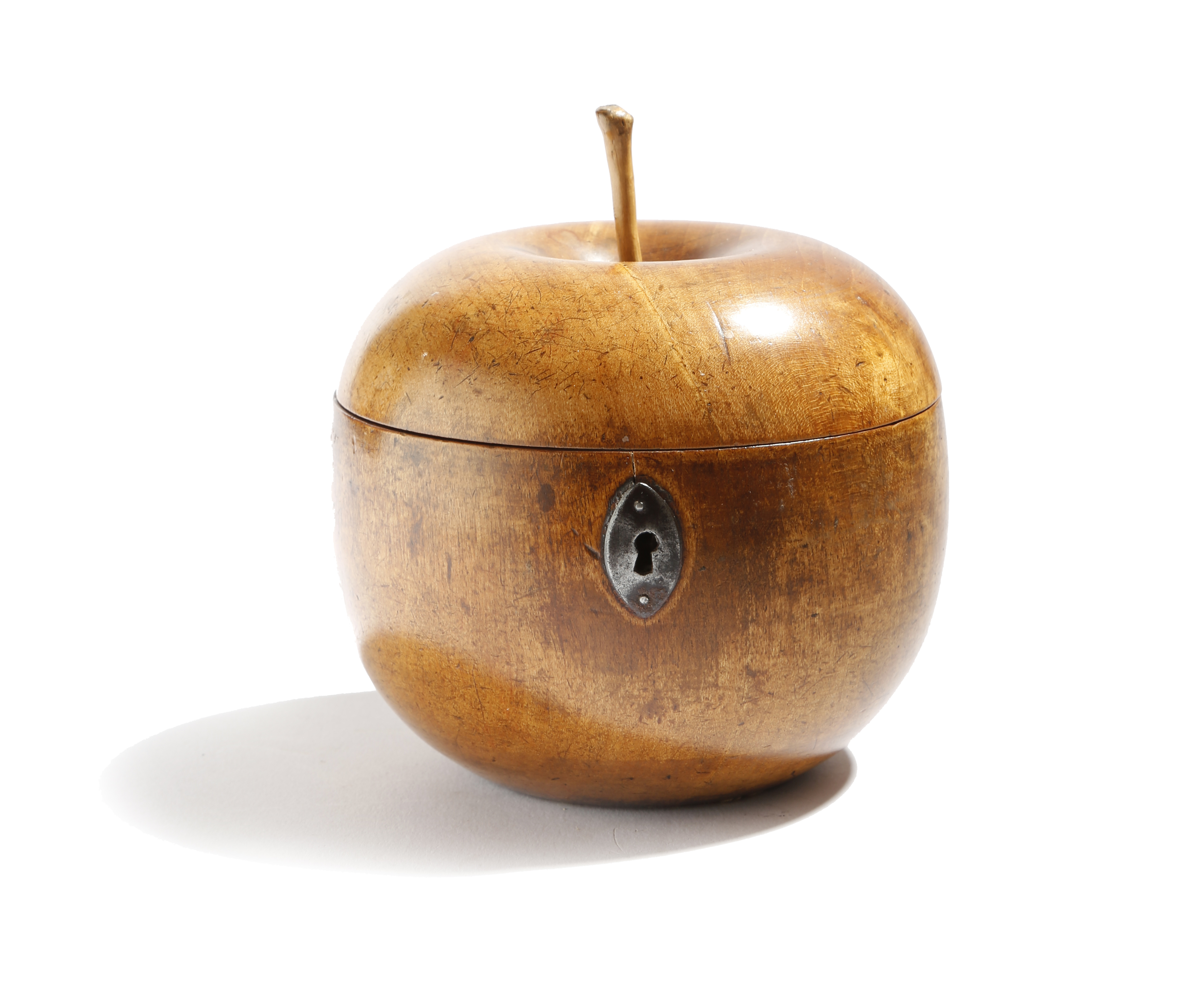 A treen fruitwood tea caddy in the form of an apple, with a stalk finial, the formerly hinged lid revealing an interior with traces of foil, with a navette shape steel escutcheon, late 18th / early 19th century, 13.3cm high.