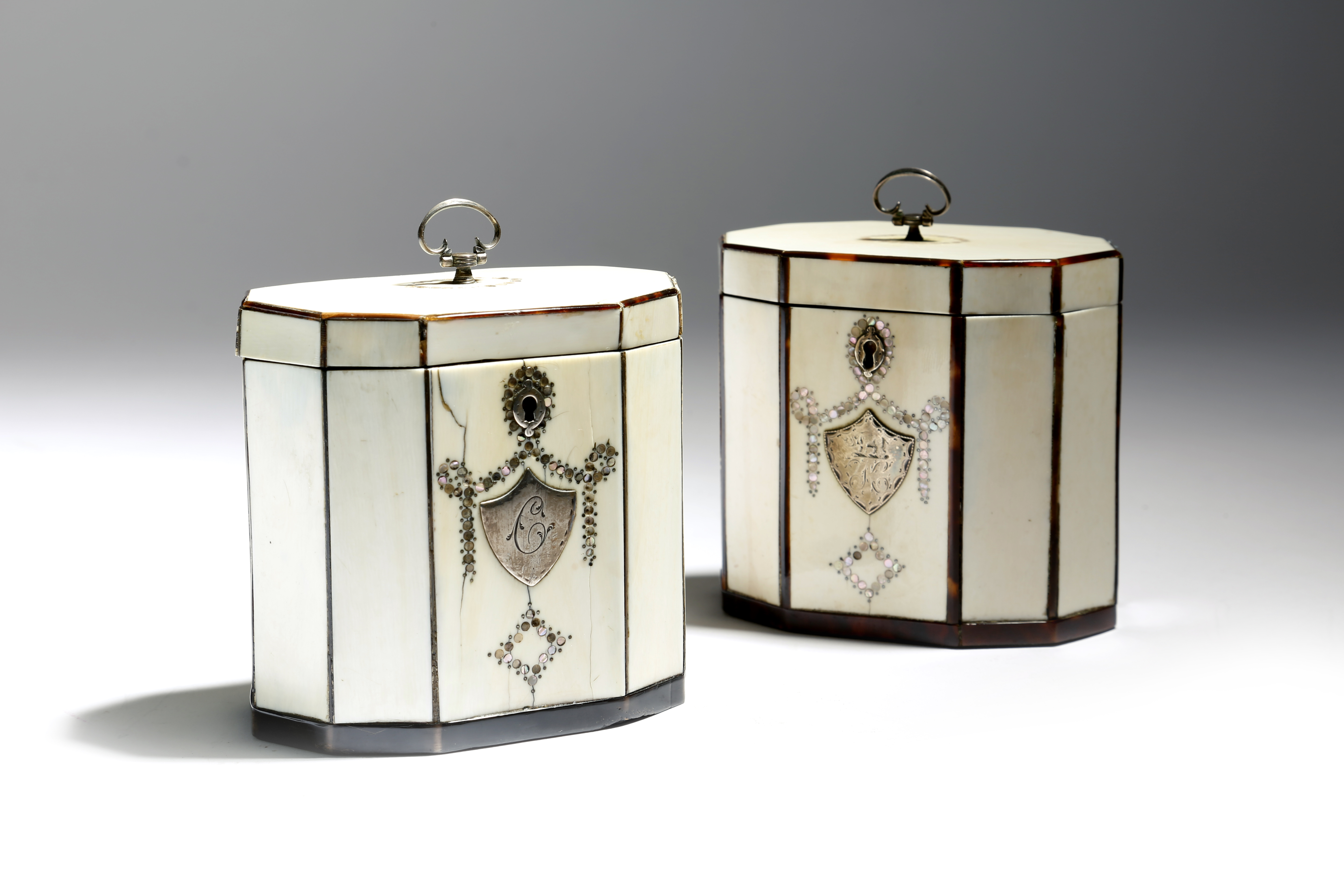 λ A near pair of George III ivory tea caddies, of octagonal shape, with tortoiseshell edging and inlaid with silver piqué work and mother of pearl dot decoration, each with a ring handle, a silver escutcheon and a shield shape plaque, one engraved with an elephant crest and the initial 'K', possibly for Knowles or Knollys, the other with the initial 'C', with vacant interiors, 11cm high, 11cm wide. (2)