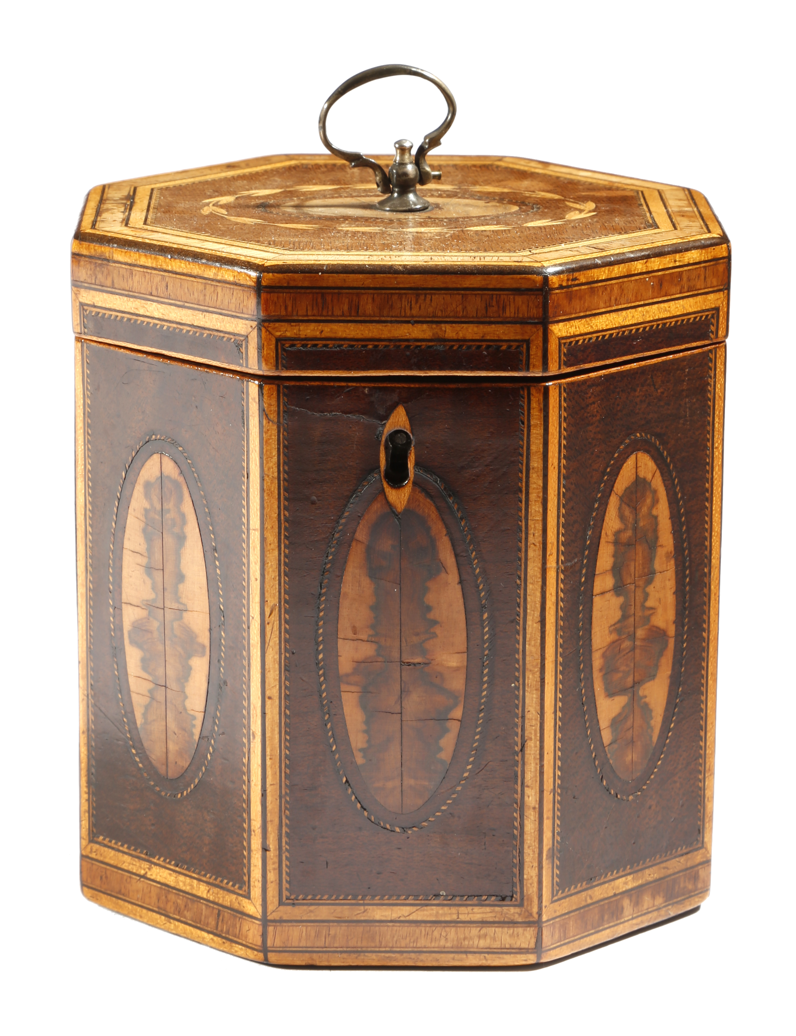 A George III harewood octagonal tea caddy, inlaid with stringing and tulipwood and planewood banding, the hinged lid with a wreath of husks and a brass ring handle, the interior with a lid with an oval burr panel, the exterior decorated with oval panels of various woods, three with book matched veneers, 13.9cm high.