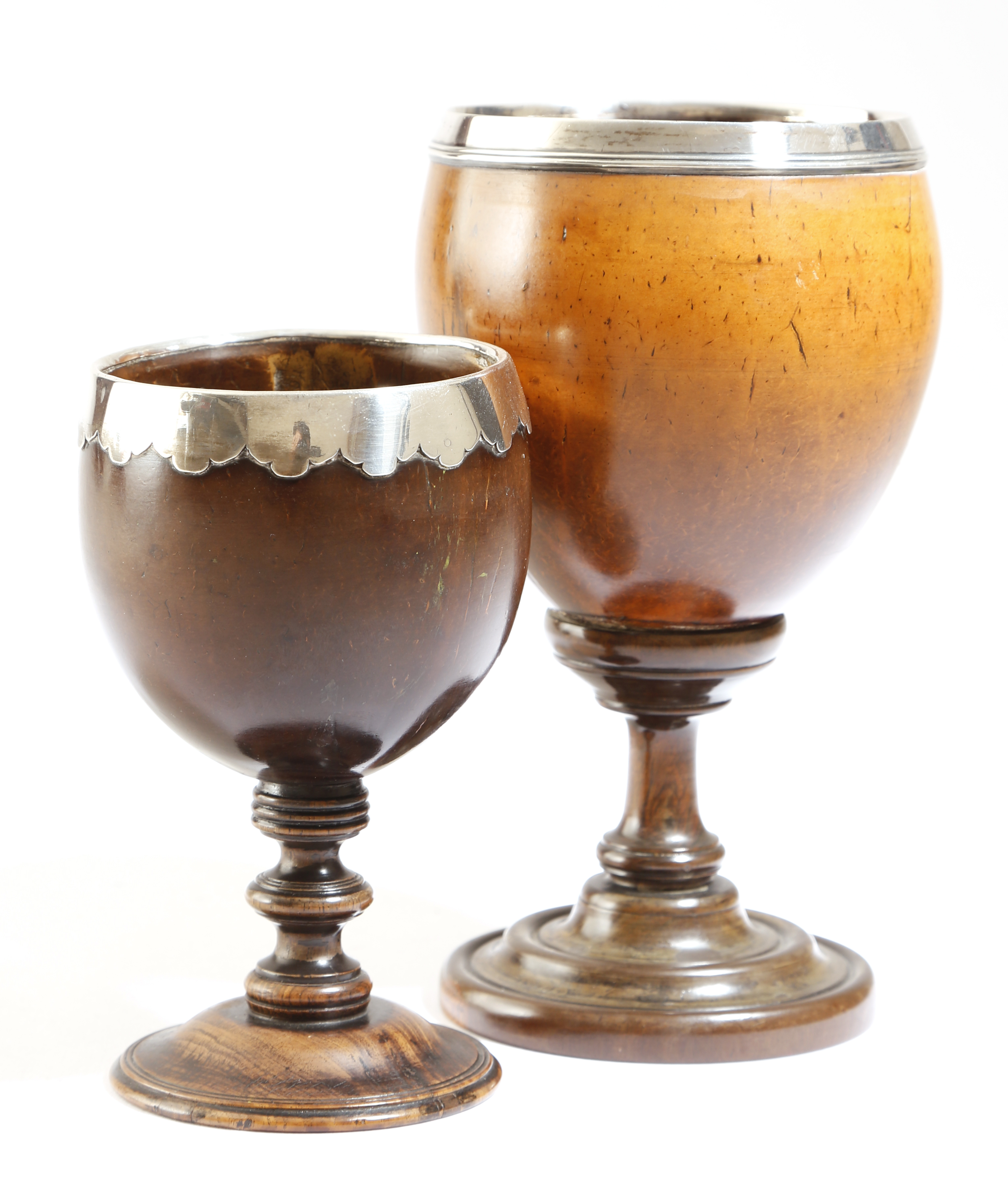 Two 18th century coconut cups, each with a silver rim, unmarked, on a turned treen stem and circular foot, 17.5cm high (max). (2)