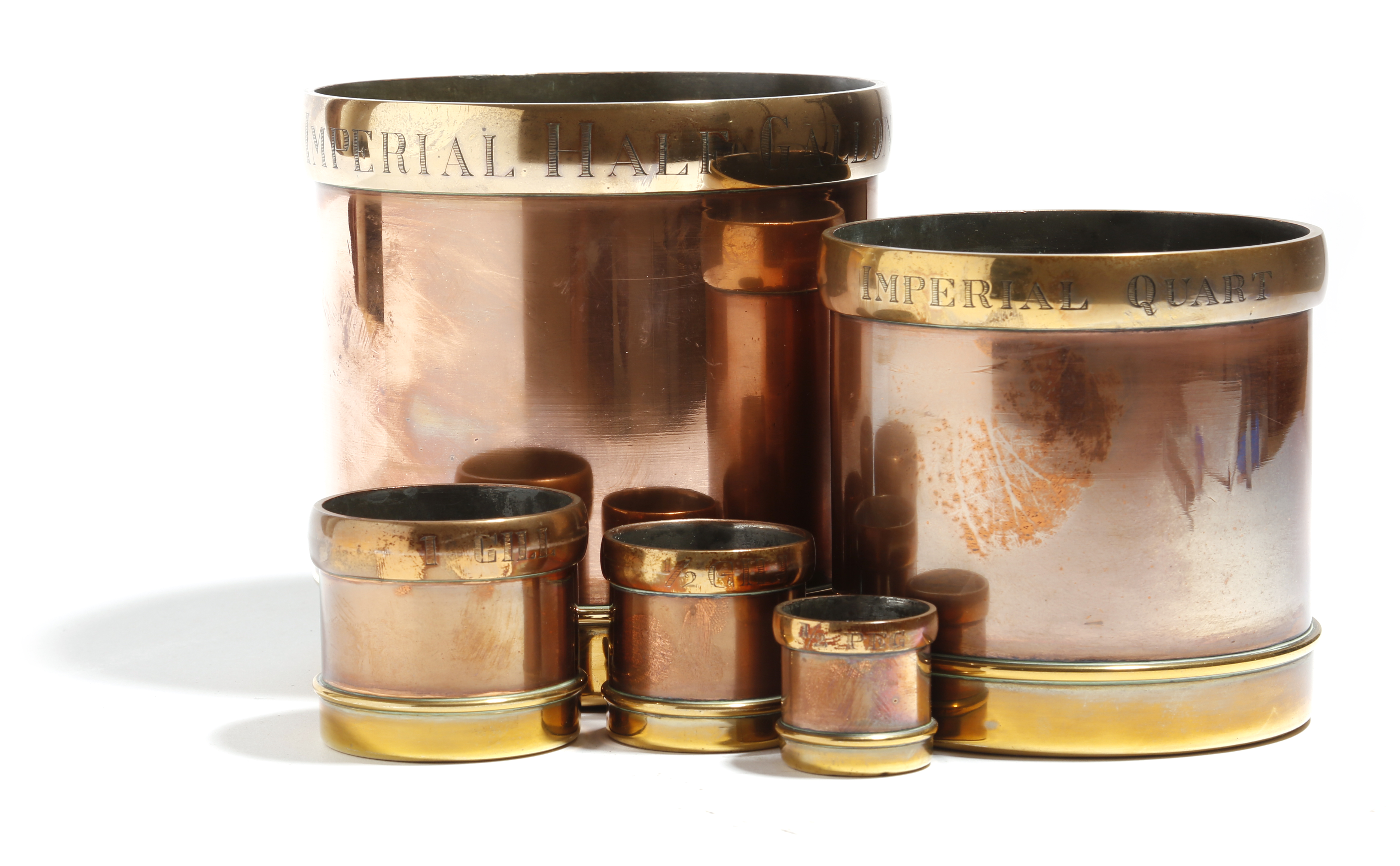 A set of five Victorian brass and copper imperial measures, of cylindrical shape, engraved with quantities: half gallon, quart, gill, half gill and half peg, 15cm high (max). (5)