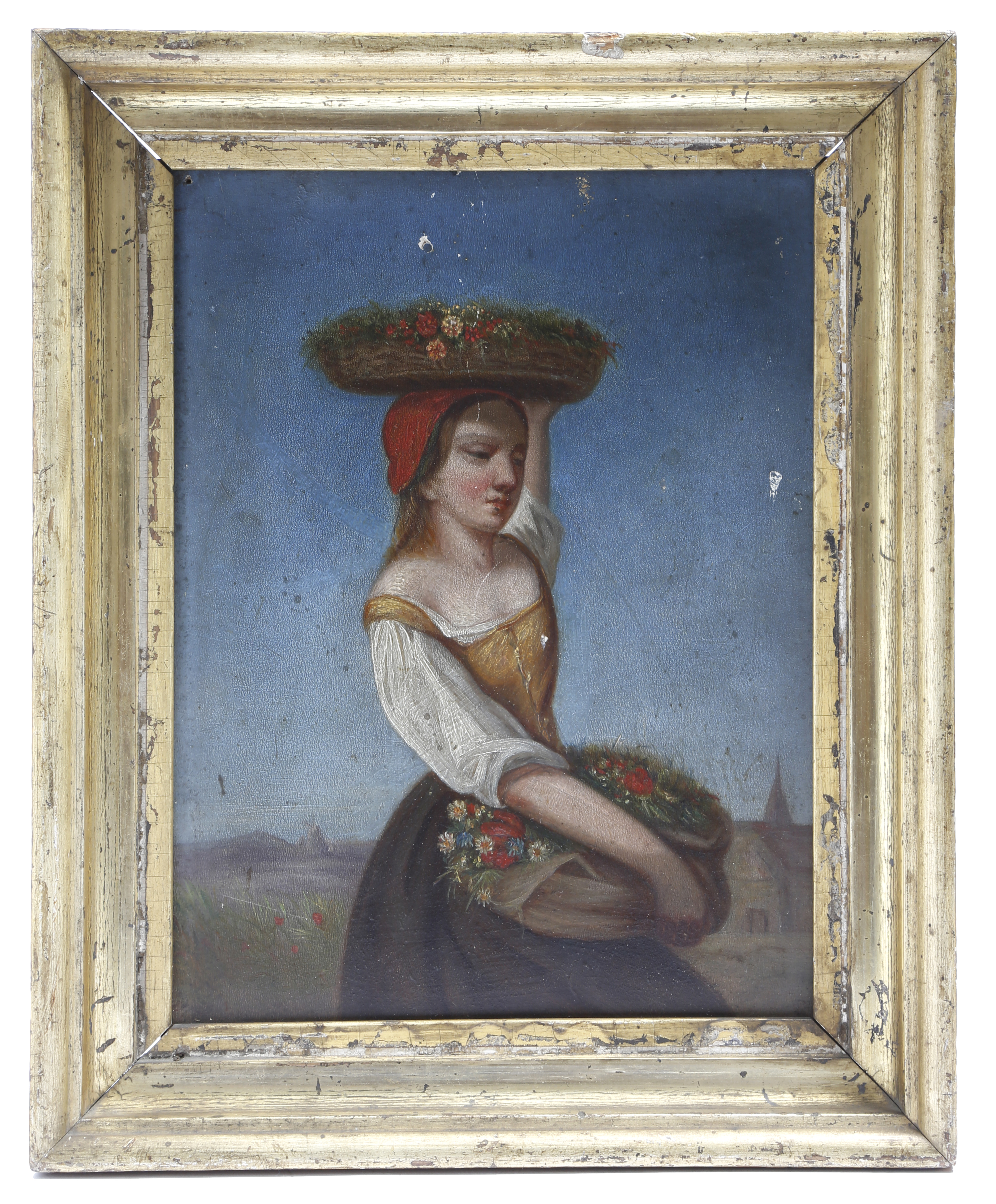 Continental School (early 19th century). A painting of a flower girl, oil on board, with stencil mark to verso '2 MOLLER? a Paris', 22.8 x 17.1cm, in a moulded giltwood frame.