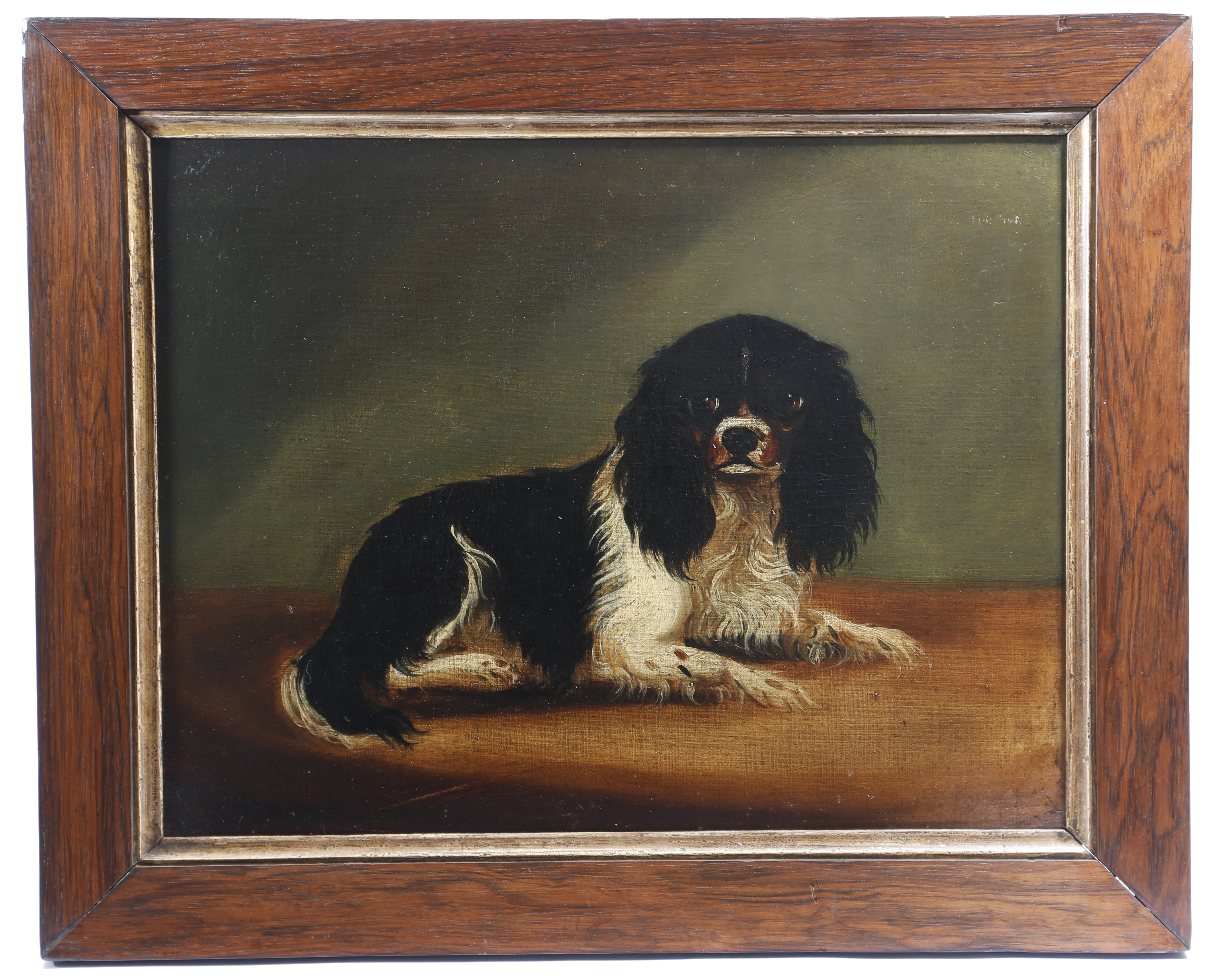 λ English School (19th century). A pair of naive paintings of King Charles spaniels, oil on canvas, 33.5 x 44cm, each in a rosewood frame. (2)