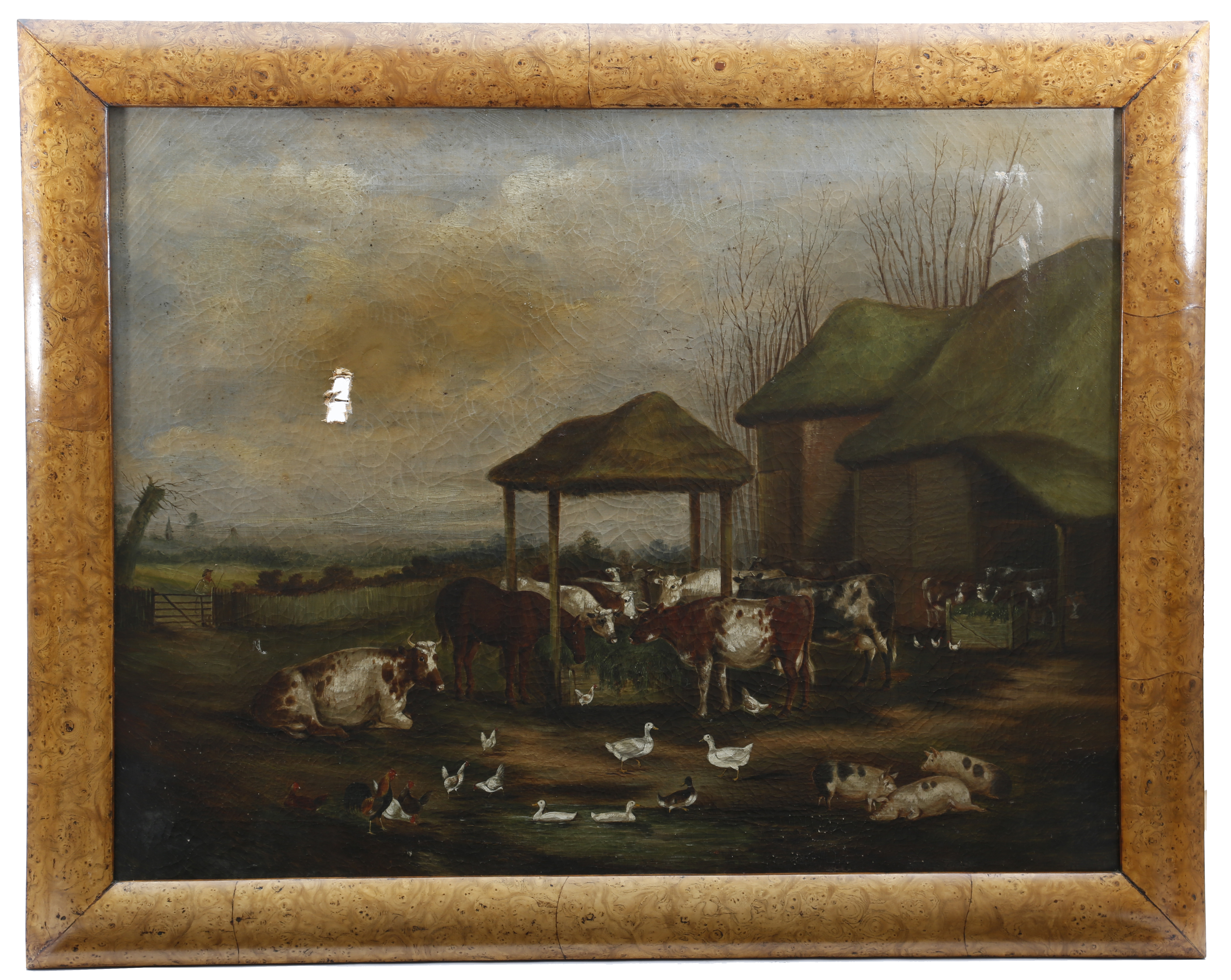 English School (19th century). A naive painting of a farmyard scene, with cows, pigs, ducks and chickens, with a farmer at a gate, oil on canvas, 68.8 x 90cm, in a later burr elm frame.