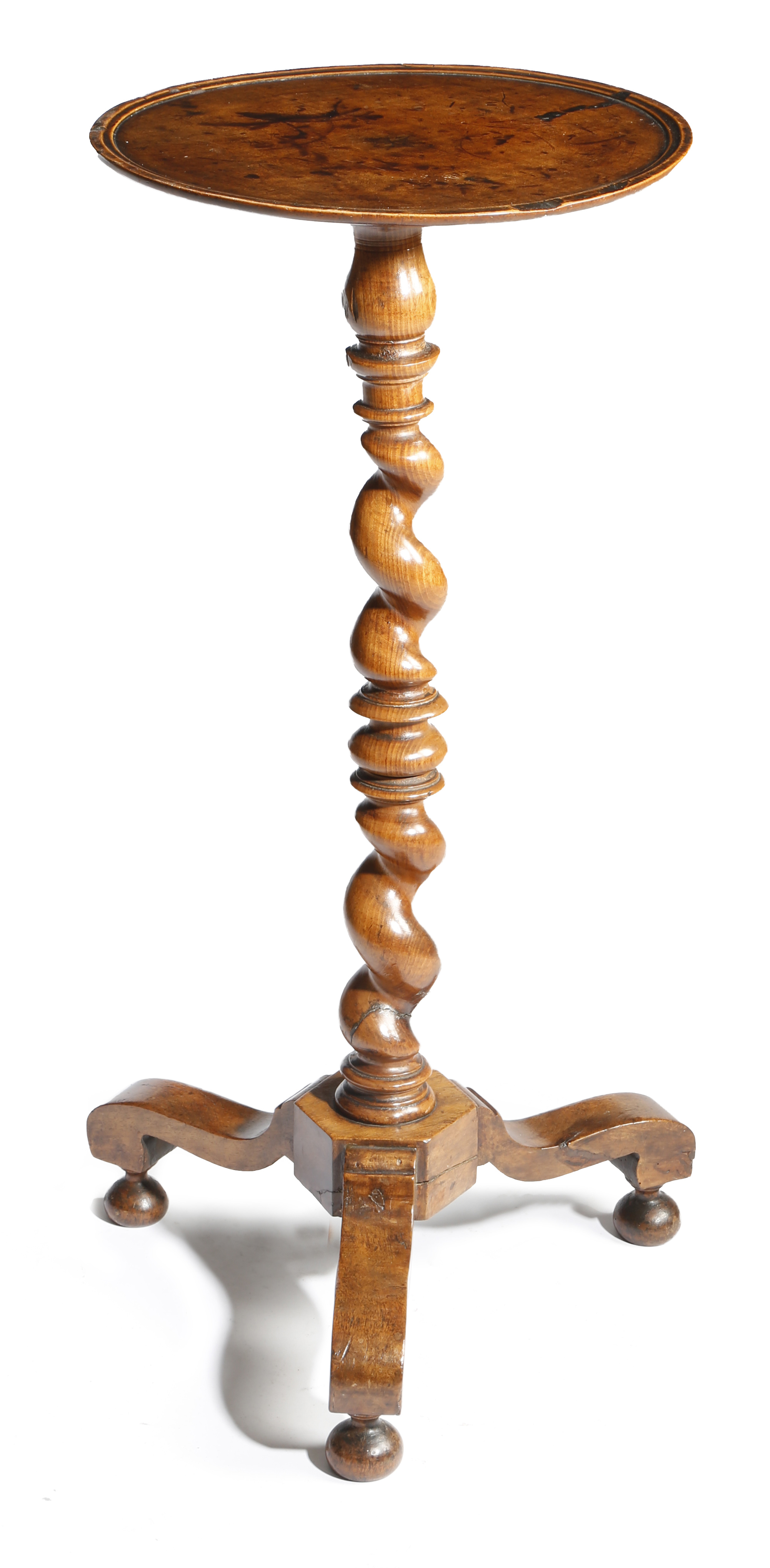 An early 18th century walnut candlestand, the dished circular top above a spiral twist stem and on tripod supports and ball feet, 74cm high, 38cm wide.